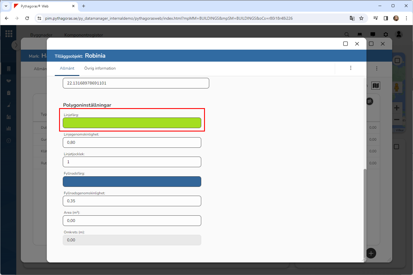 Sätt en linjefärg på den polygon du ska rita in på kartan (se bilden nedan). Detta genom att klicka i fältet med namnet "Linjefärg" och sedan välja en linjefärg i fönstret med namnet "Linjefärg". Obs! Detta behöver du bara göra om du vill att linjefärgen på den polygon du ska rita in på kartan ska vara en annan än den standardfärg som är satt på den.