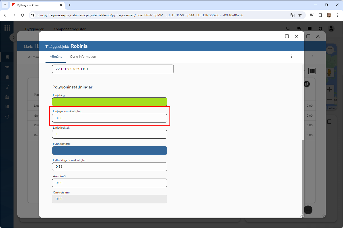 Ange hur genomskinliga linjerna på den polygon du ska rita in på kartan ska vara (se bilden nedan). Detta genom att ange en linjegenomskinlighet i fältet med namnet "Linjegenomskinlighet". Ju lägre linjegenomskinlighet, desto genomskinligare blir linjerna.
