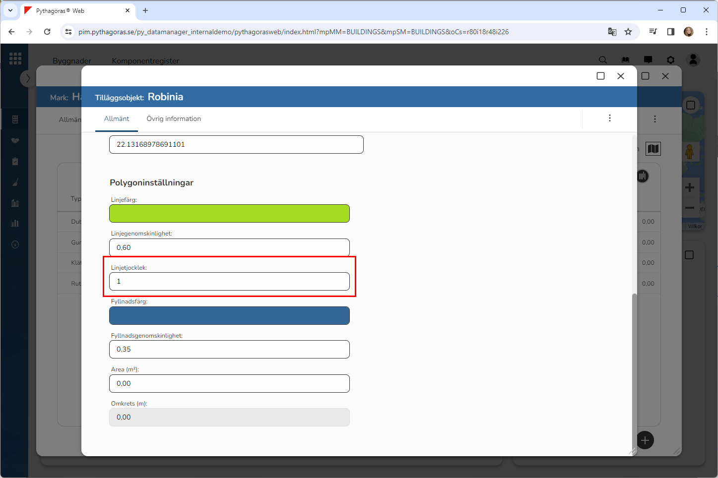 Ange hur tjocka linjerna på den polygon du ska rita in på kartan ska vara (se bilden nedan). Detta genom att ange en tjocklek i fältet med namnet "Linjetjocklek". Ju lägre linjetjocklek, desto tunnare blir linjerna.