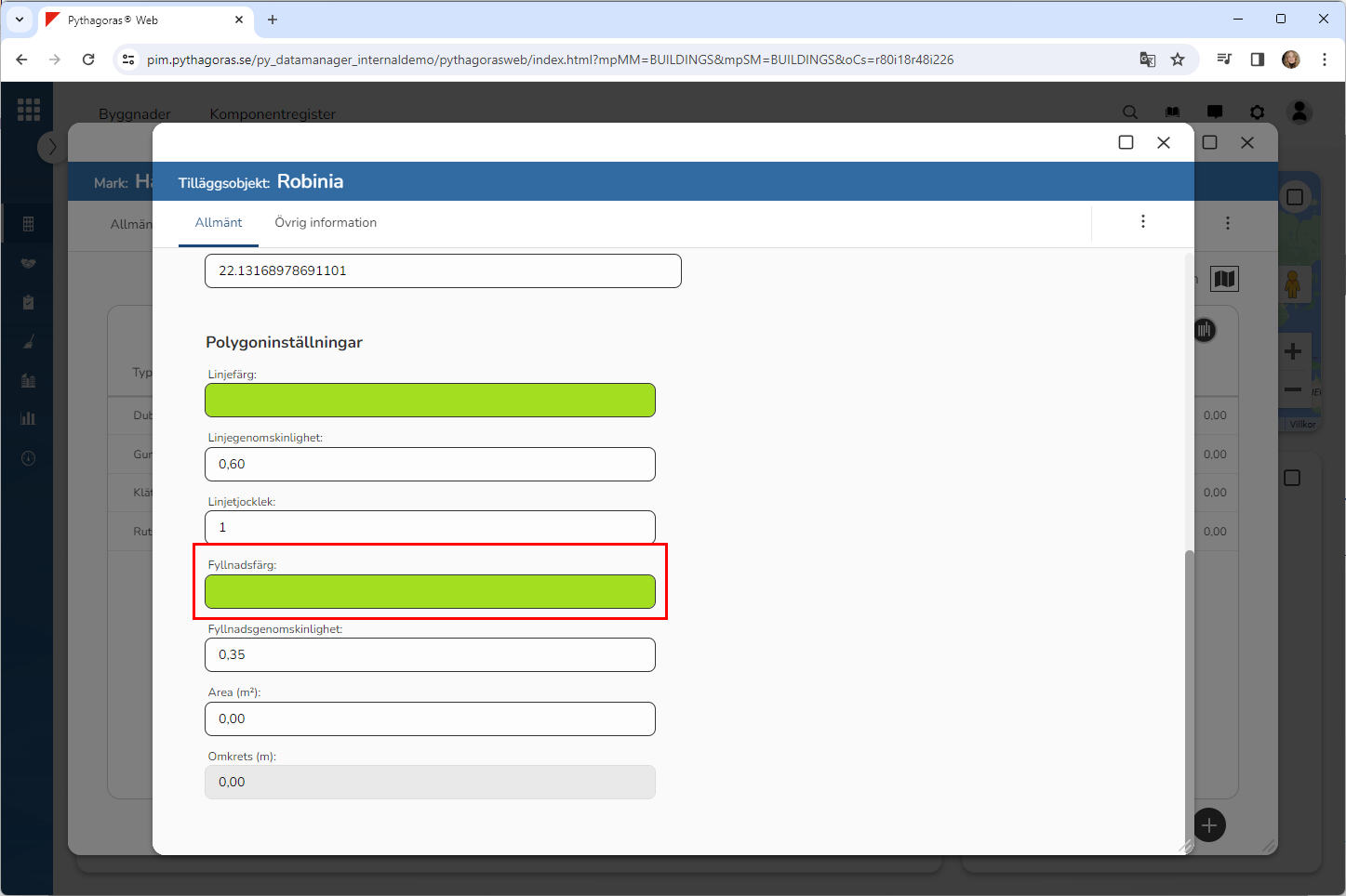 Genom att rita in en polygon på kartan kan du visa utbredningen för ett tilläggsobjekt på den.