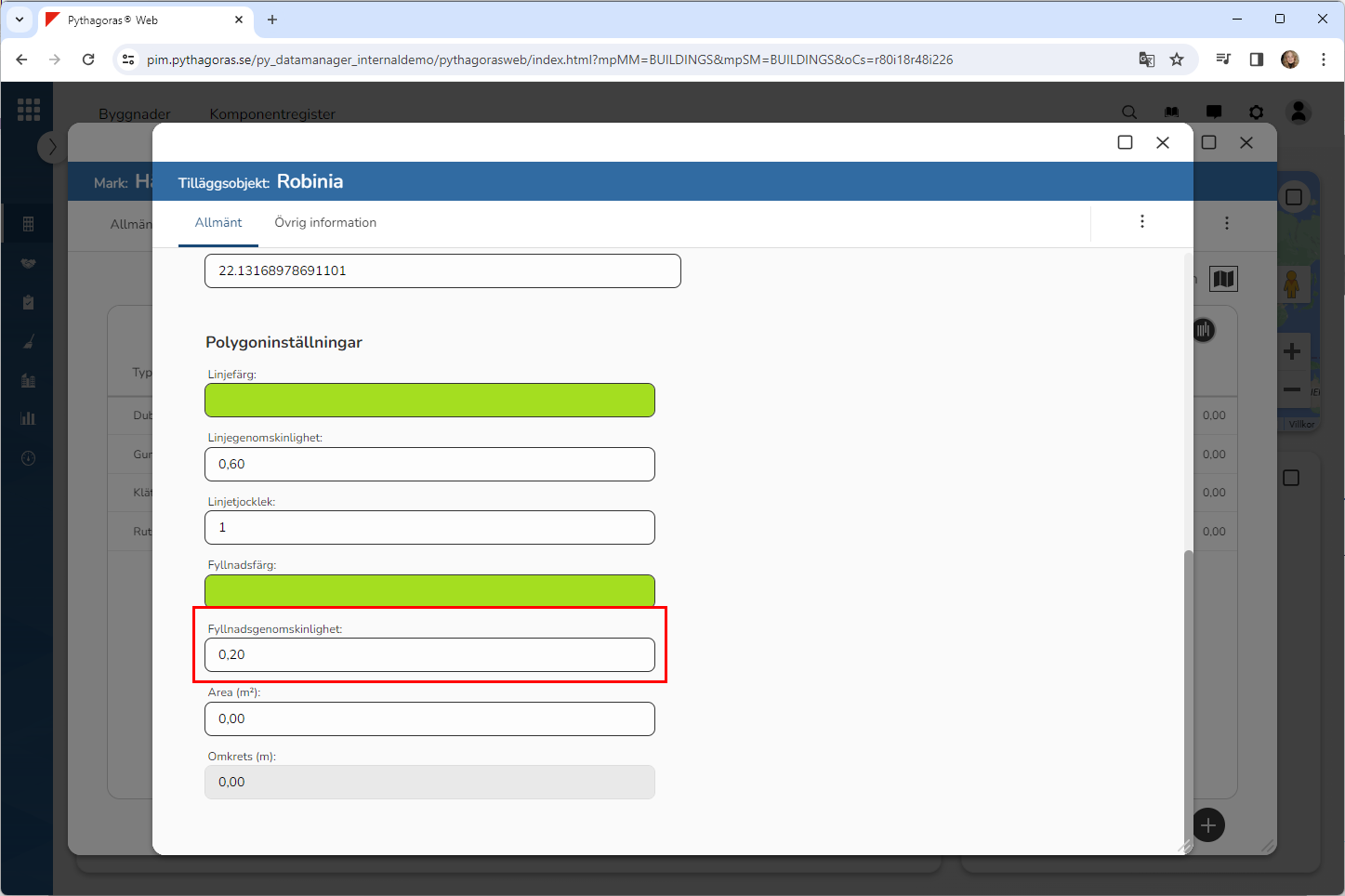 Ange hur genomskinlig fyllnaden på den polygon du ska rita in på kartan ska vara (se bilden nedan). Detta genom att ange en fyllnadsgenomskinlighet i fältet med namnet "Fyllnadsgenomskinlighet". Ju lägre fyllnadsgenomskinlighet, desto genomskinligare blir fyllnaden.