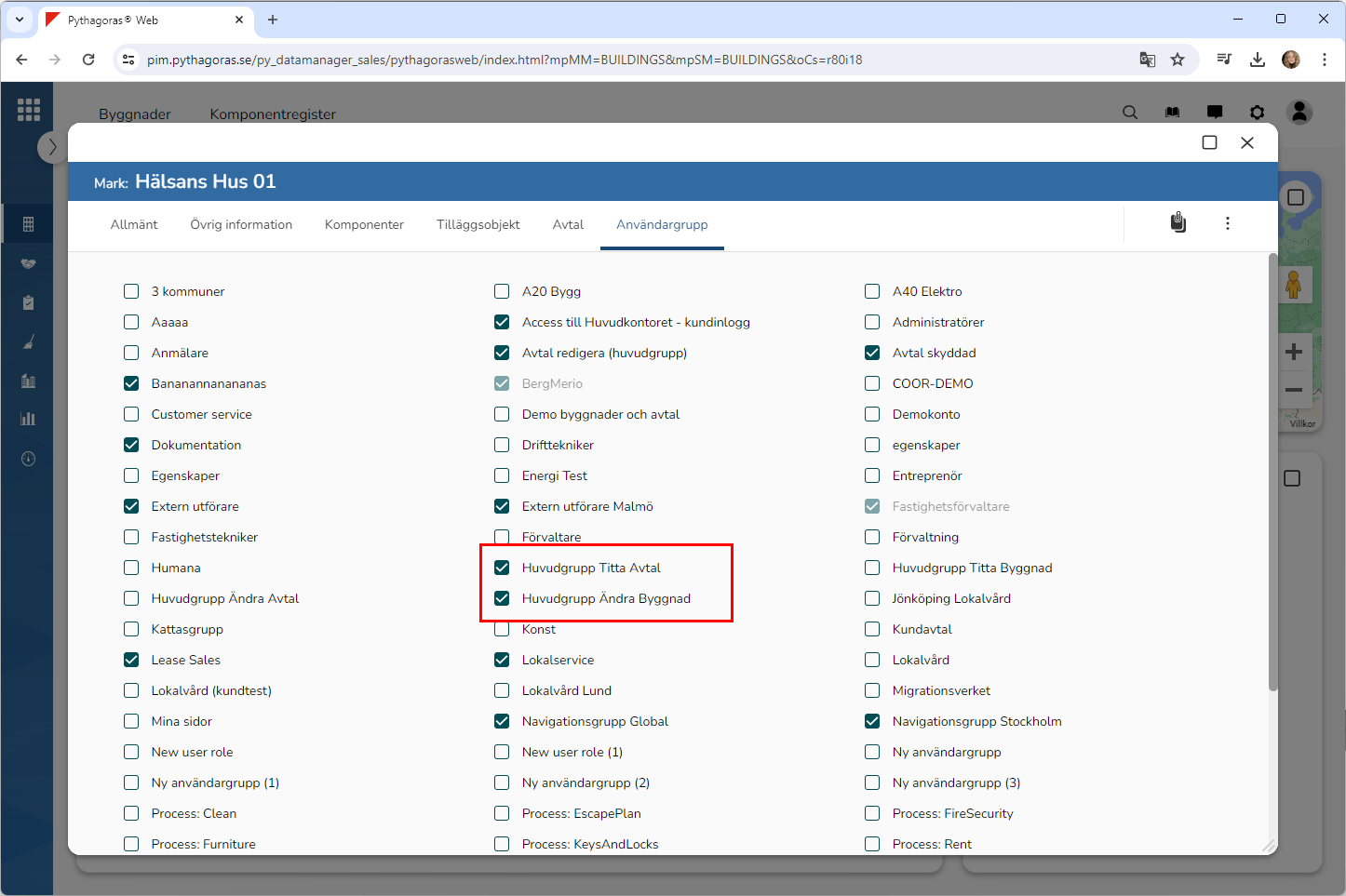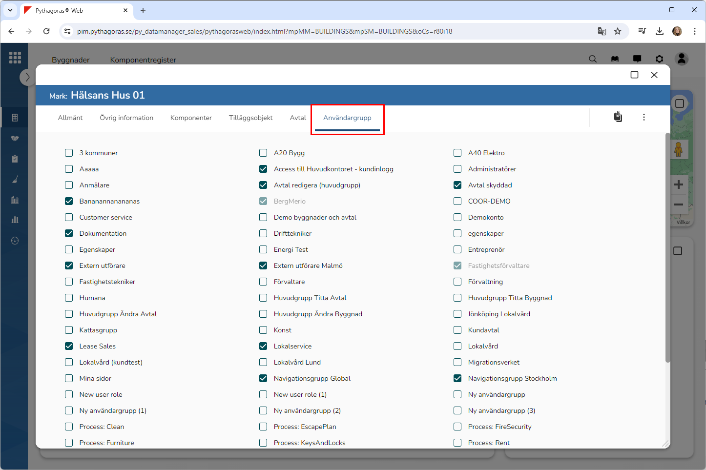 Kryssa för en eller fler användargrupper i listan med användargrupper (se bilden nedan). Notera att den eller de användargrupper du kryssar för kommer att sättas på det markobjekt du arbetar med och att det betyder att de kommer att få tillgång till markobjektet.