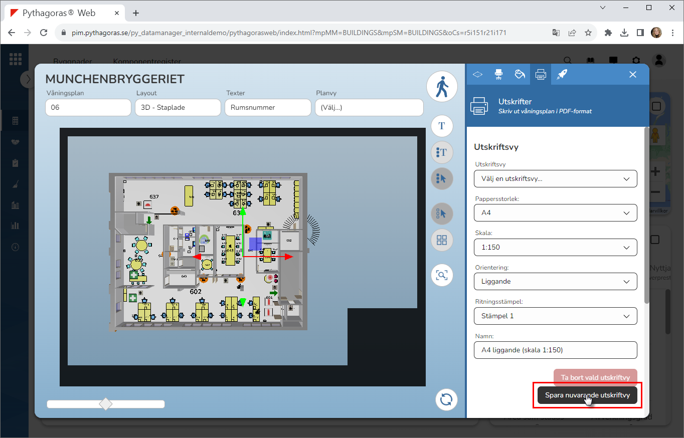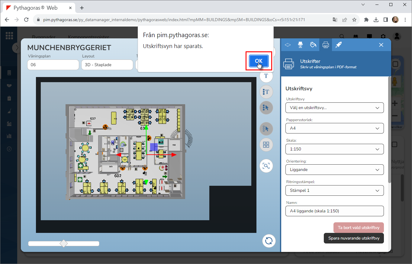 Klicka på knappen med namnet "Spara nuvarande utskriftsvy" (se den första bilden nedan). När du klickar på knappen med namnet "Spara nuvarande utskriftsvy" kommer en utskriftsvy med det namn och den pappersstorlek, pappersorientering, skala och ritningsstämpel du har valt, att skapas. När en utskriftsvy har skapats får du tillgång till en dialogruta via vilken du får följande meddelande: "Utskriftsvyn har sparats" (se den andra bilden nedan).