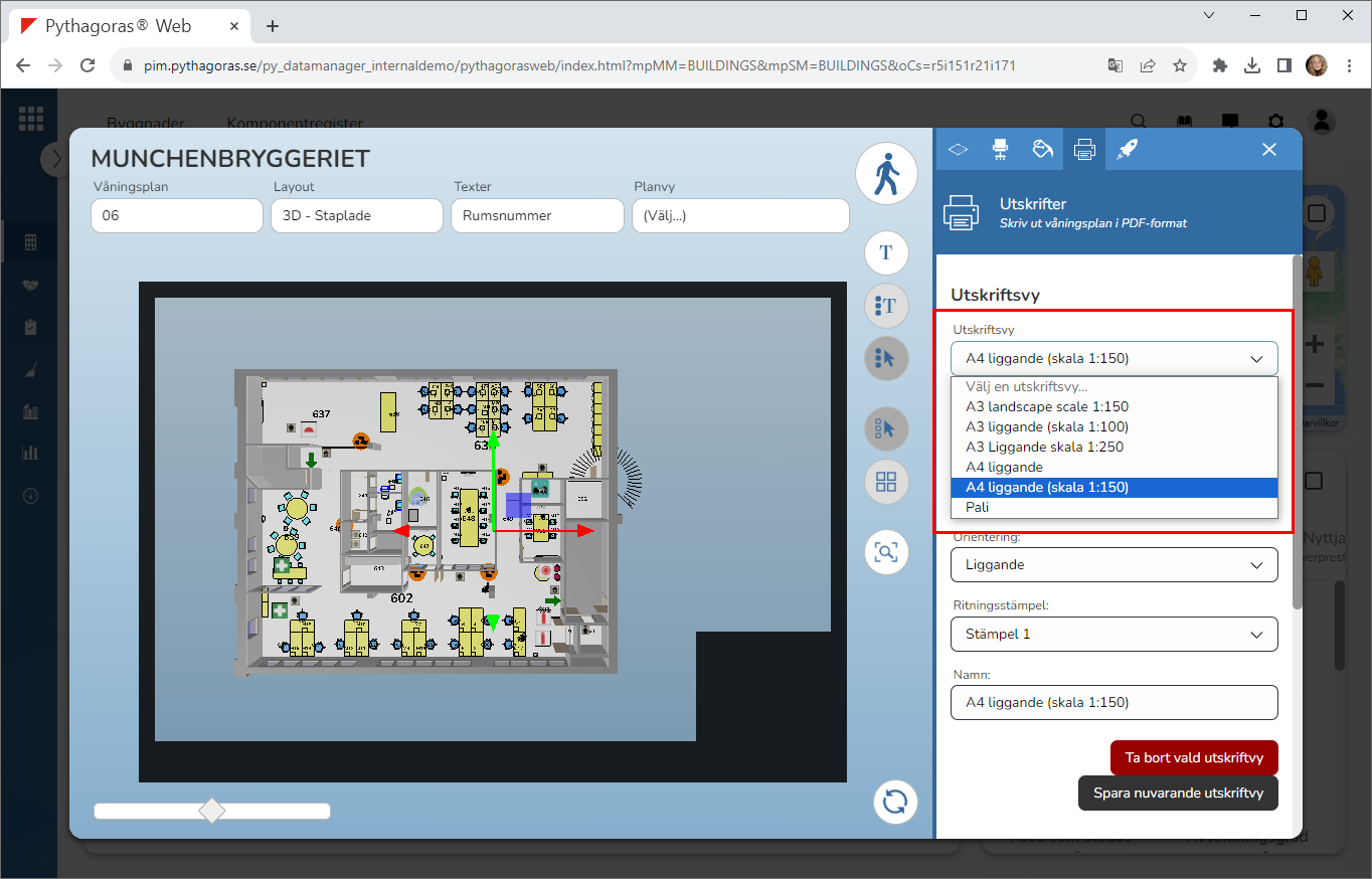 Sätt en pappersstorlek på den utskriftsvy du ska skapa (se bilden nedan). Detta genom att klicka i fältet med namnet "Pappersstorlek" och sedan välja en pappersstorlek i listan med pappersstorlekar.