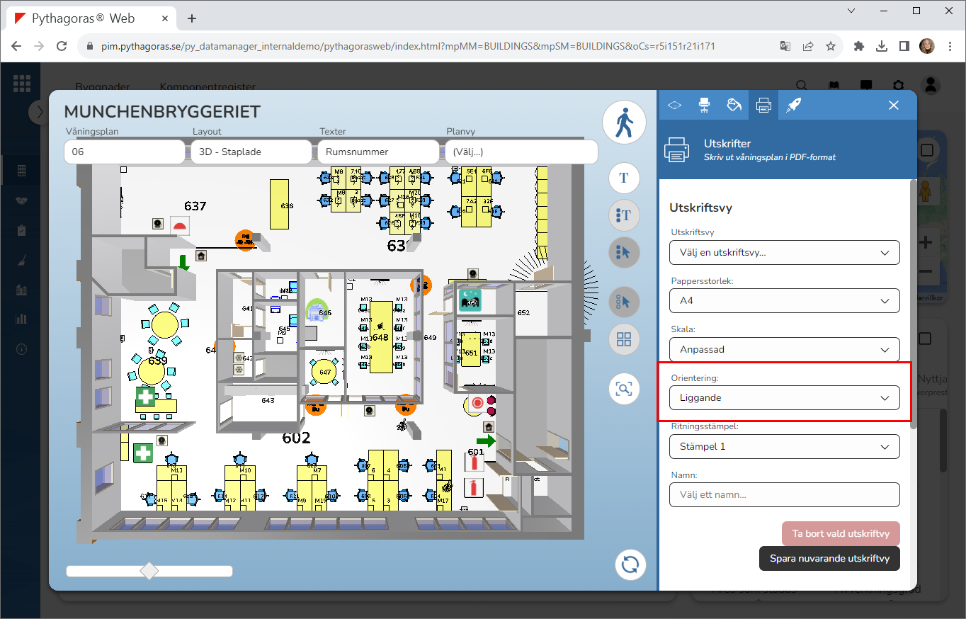 Sätt en pappersorientering på den utskriftsvy du ska skapa (se bilden nedan). Detta genom att klicka i fältet med namnet "Orientering" och sedan välja en pappersorientering i listan med pappersorienteringar.