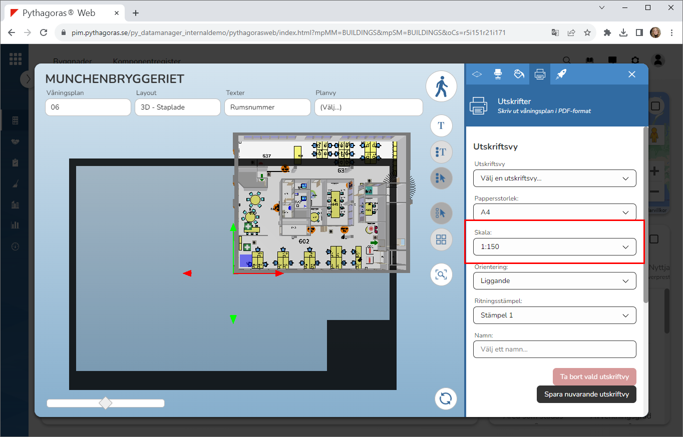 Välj en skala (se den första bilden nedan). Detta genom att klicka i fältet med namnet "Skala" och sedan välja en skala i listan med skalor. När du har valt en skala blir en bildram tillgänglig i ritytan (se den andra bilden nedan). Notera att du kanske måste zooma ut ur ritytan för att bildramen ska bli synlig i den.