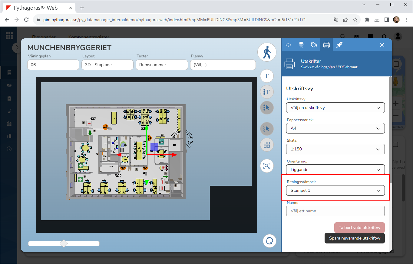 Sätt en ritningsstämpel på den utskriftsvy du ska skapa (se bilden nedan). Detta genom att klicka i fältet med namnet "Ritningsstämpel" och sedan välja en ritningsstämpel i listan med ritningsstämplar. Obs! Den bildram du ser i anslutning till modellen i bilden nedan är bara synlig om du valde en skala i instruktionssteg 5.