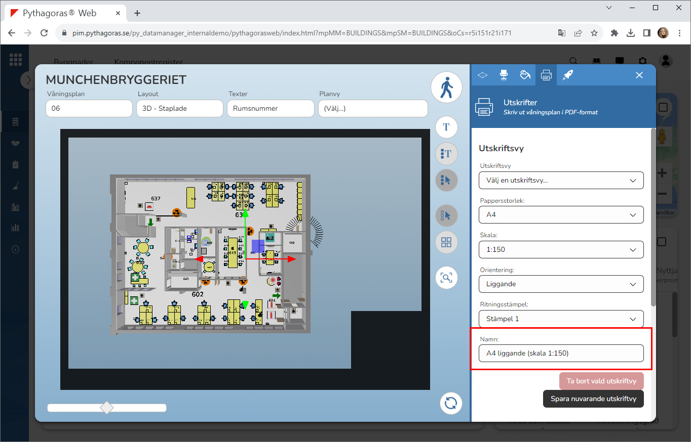 Sätt ett namn på den utskriftsvy du ska skapa (se bilden nedan). Detta genom att ange ett namn i fältet med namnet "Namn".