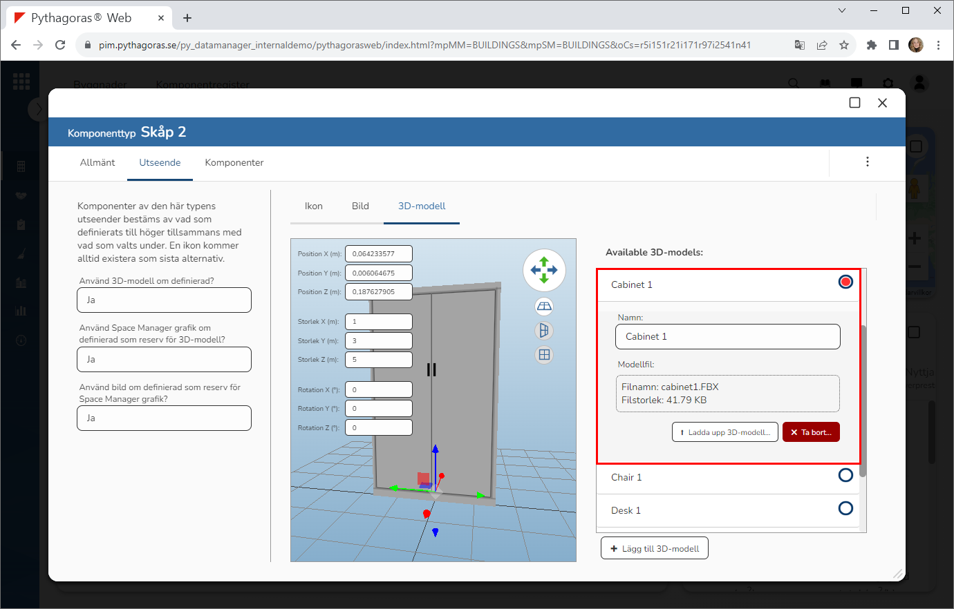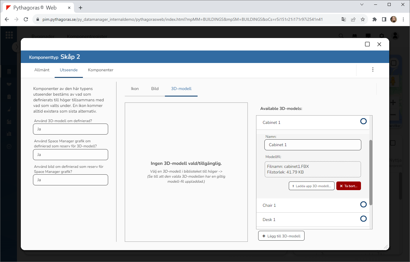 När du tar bort 3D-modellen från en komponenttyp tas 3D-modellen också bort från alla komponenter av den aktuella typen, vilket betyder att alla komponenter av den aktuella typen omvandlas till 2D-komponenter. 3D-modellen ligger dock kvar i Pythagoras webb så att du och dina kollegor kan använda den för att definiera 3D-modeller för andra komponenttyper.