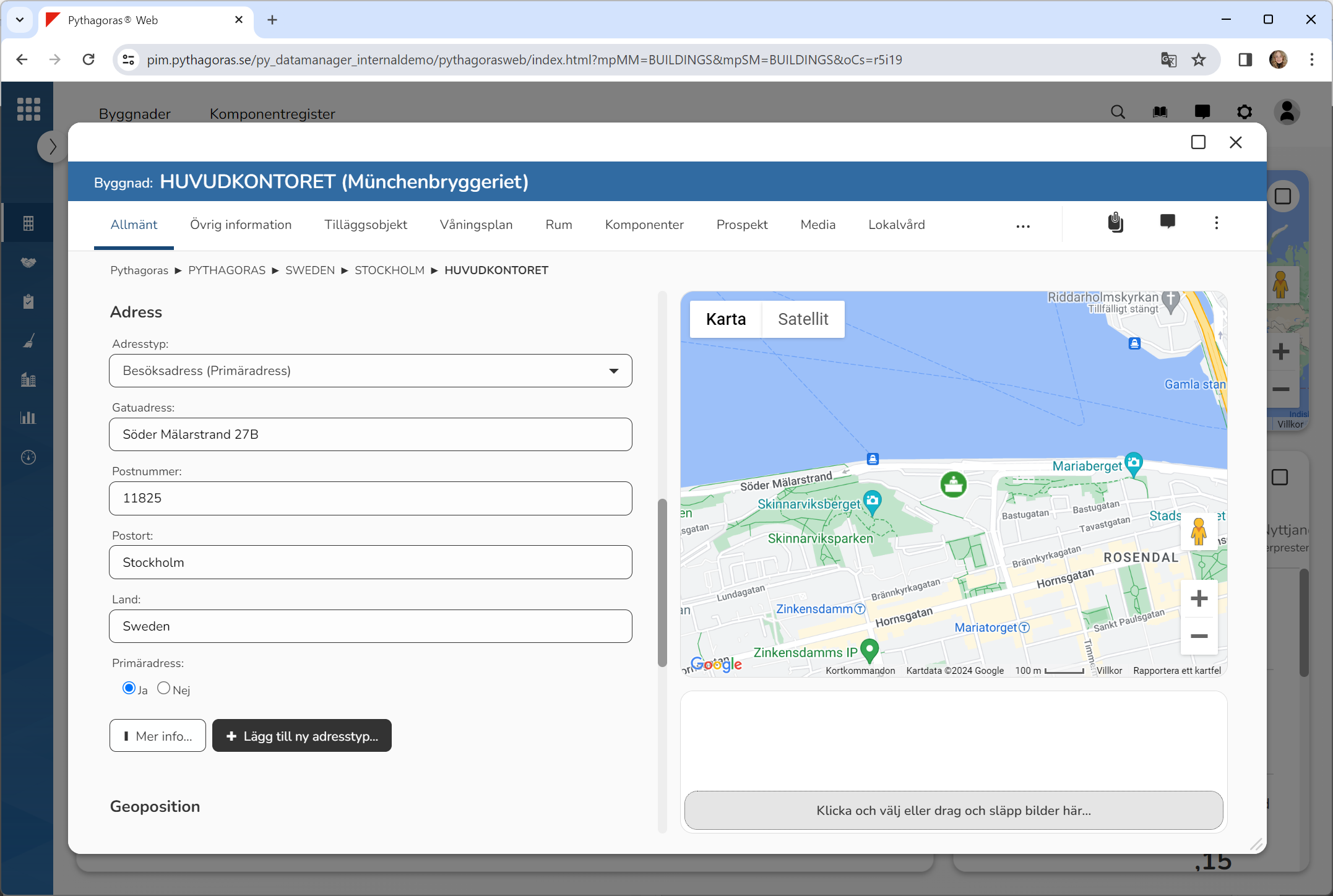 Öppna den byggnad du vill ta bort en adress från. För mer information om hur du öppnar en byggnad, se avsnitt 4.6.1., 5.4.3. eller 6.1.1.