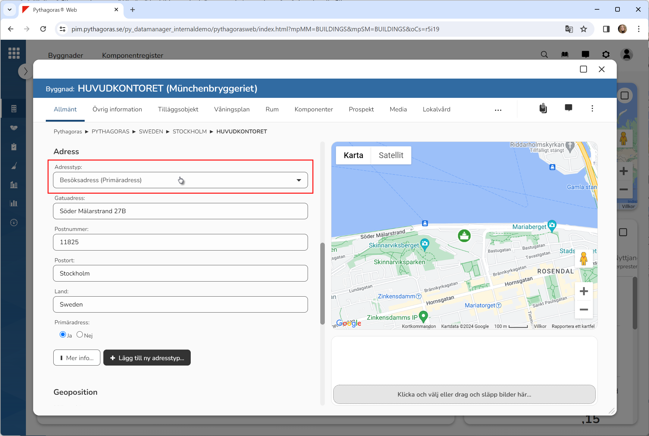 Klicka i fältet med namnet "Adresstyp" (se den första bilden nedan). När du klickar i fältet med namnet "Adresstyp" får du tillgång till en lista med adresser som är kopplade till den byggnad du arbetar med (se den andra bilden nedan).