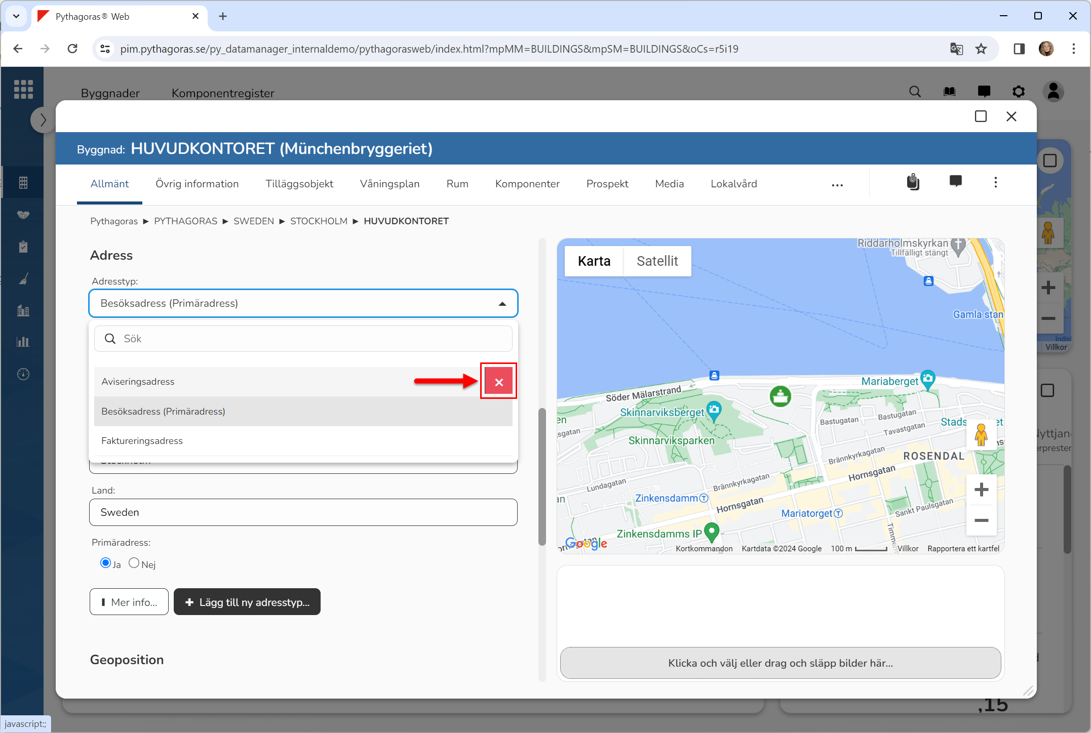 Placera din muspekare på den adress du vill ta bort från den byggnad du arbetar med (se den första bilden nedan). När du placerar din muspekare på en adress får du tillgång till en ikon med namnet "Ta bort adress" (se den andra bilden nedan).