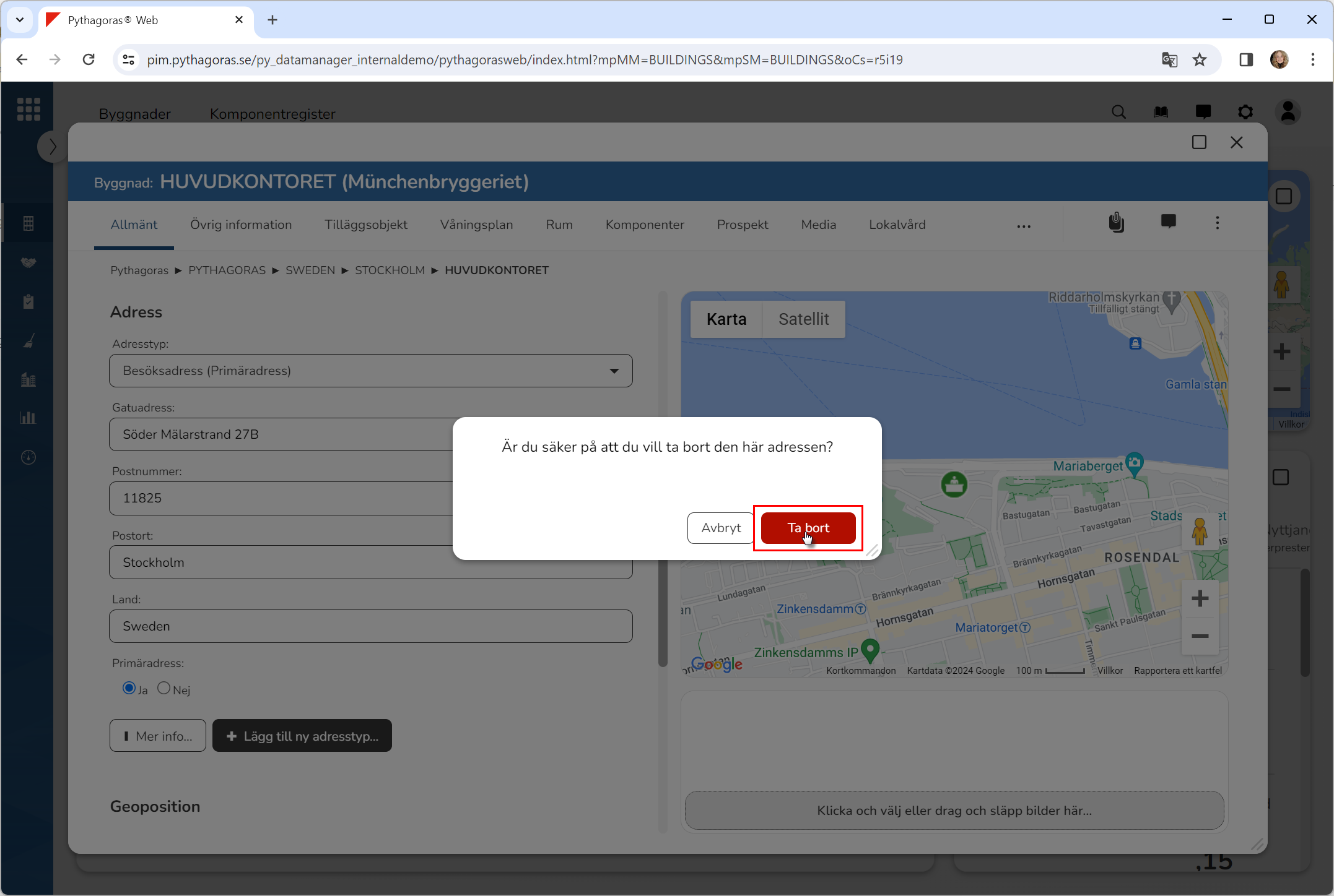 Klicka på "Ta bort" i den dialogruta du har fått tillgång till (se den första bilden nedan). När du klickar på "Ta bort" kommer den adress du arbetar med att tas bort från den byggnad du arbetar med. Detta samtidigt som du skickas tillbaka till byggnadskortet (se den andra bilden nedan).