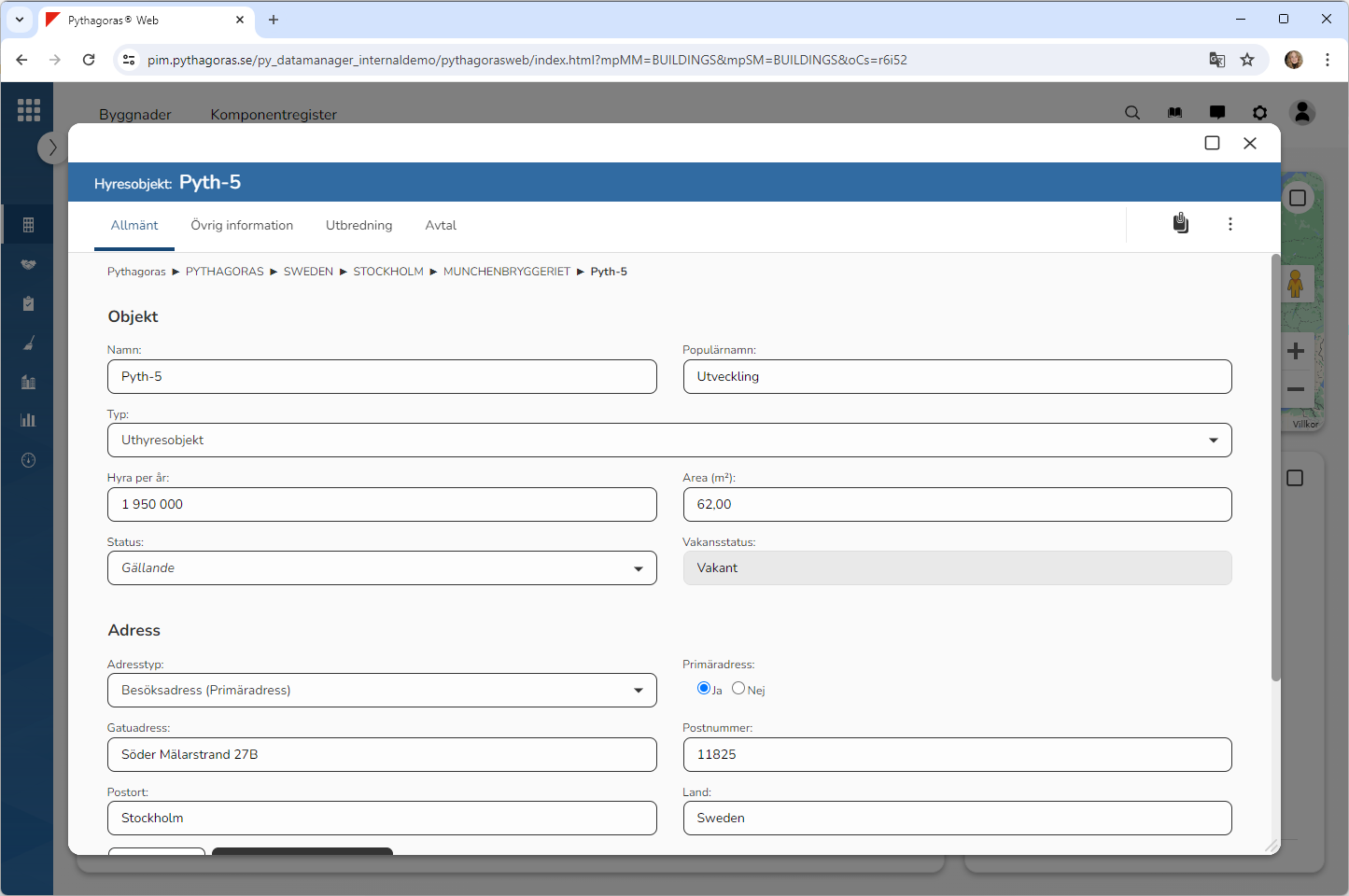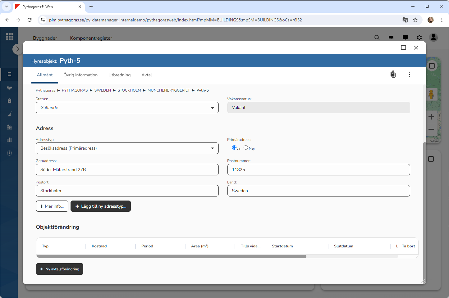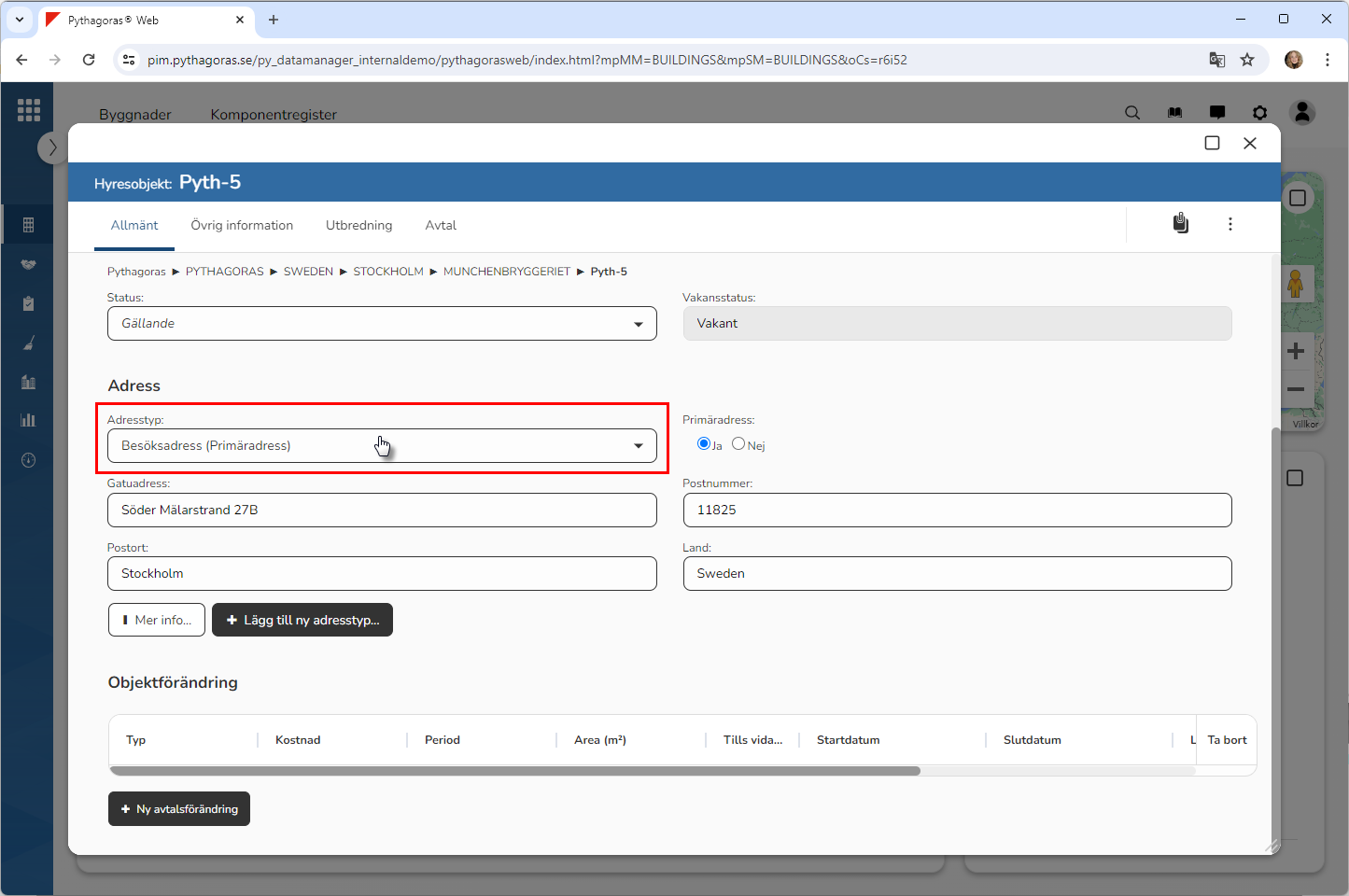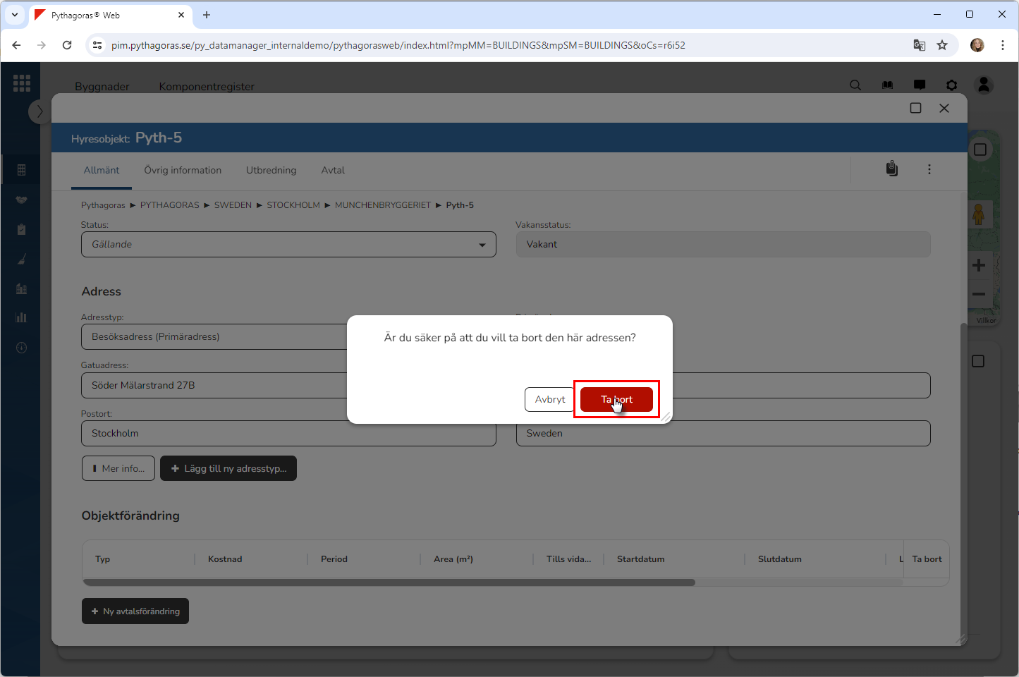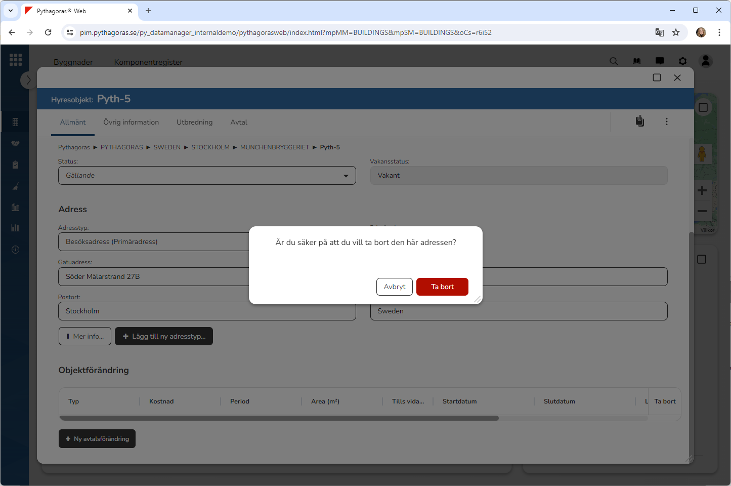Klicka på "Ta bort" i den dialogruta du har fått tillgång till (se den första bilden nedan). När du klickar på "Ta bort" kommer den adress du arbetar med att tas bort från det hyresobjekt du arbetar med. Detta samtidigt som du skickas tillbaka till hyresobjektskortet (se den andra bilden nedan).