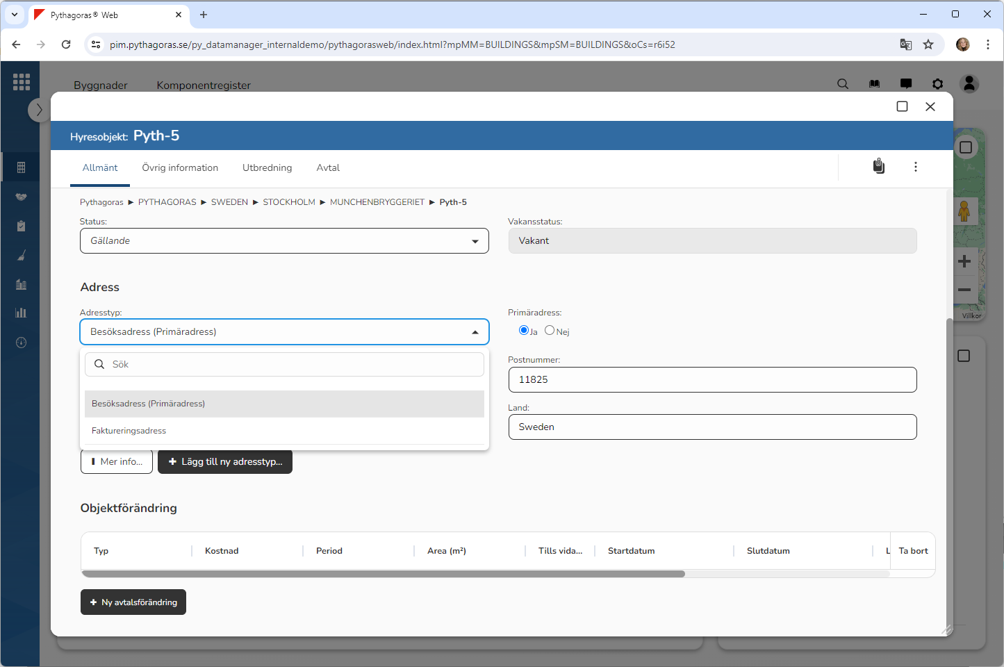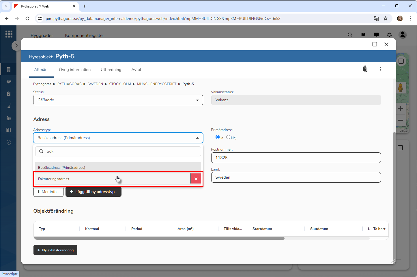 Klicka i fältet med namnet "Adresstyp" (se den första bilden nedan). När du klickar i fältet med namnet "Adresstyp" får du tillgång till en lista med adresser som är kopplade till det hyresobjekt du arbetar med (se den andra bilden nedan).