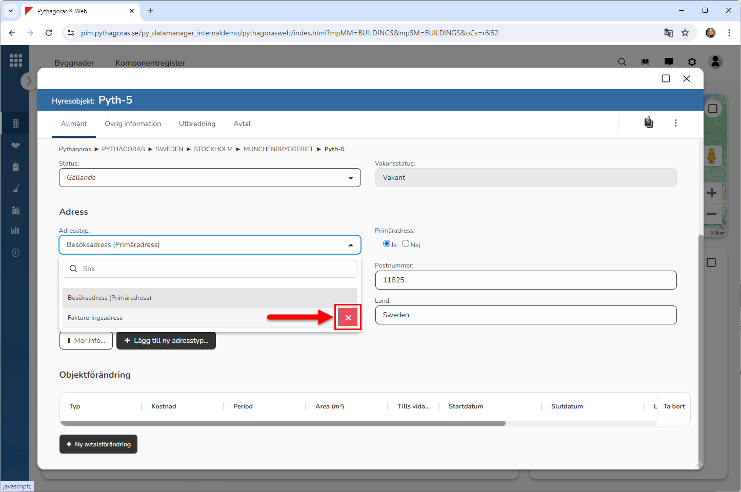 För att ta bort en adress från ett hyresobjekt, gör du så här: