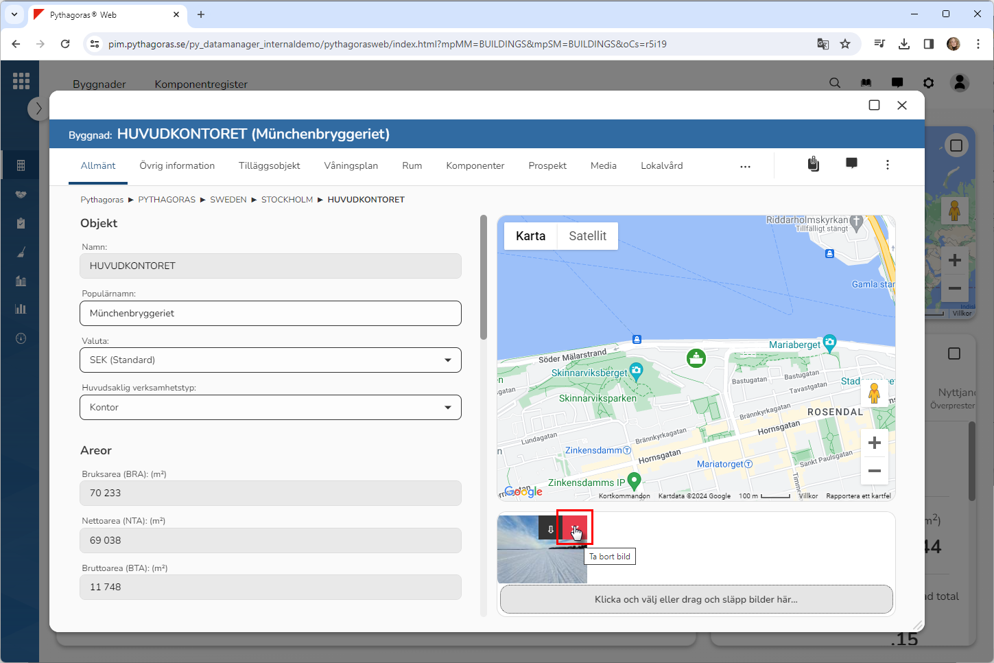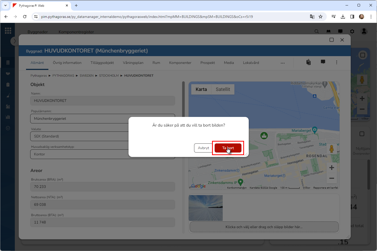 Klicka på "Ta bort" i den dialogruta du har fått tillgång till (se den första bilden nedan). När du klickar på "Ta bort" kommer den bild du arbetar med att tas bort från byggnadskortet (se den andra bilden nedan).