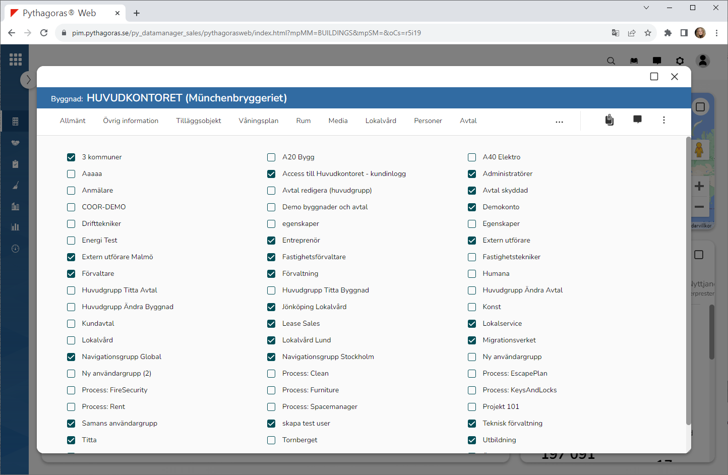 Kryssa ur en eller fler användargrupper i listan med användargrupper (se bilden nedan). Notera att den eller de användargrupper du kryssar ur kommer att tas bort från den byggnad du arbetar med och att det betyder att de kommer att förlora tillgången till byggnaden.