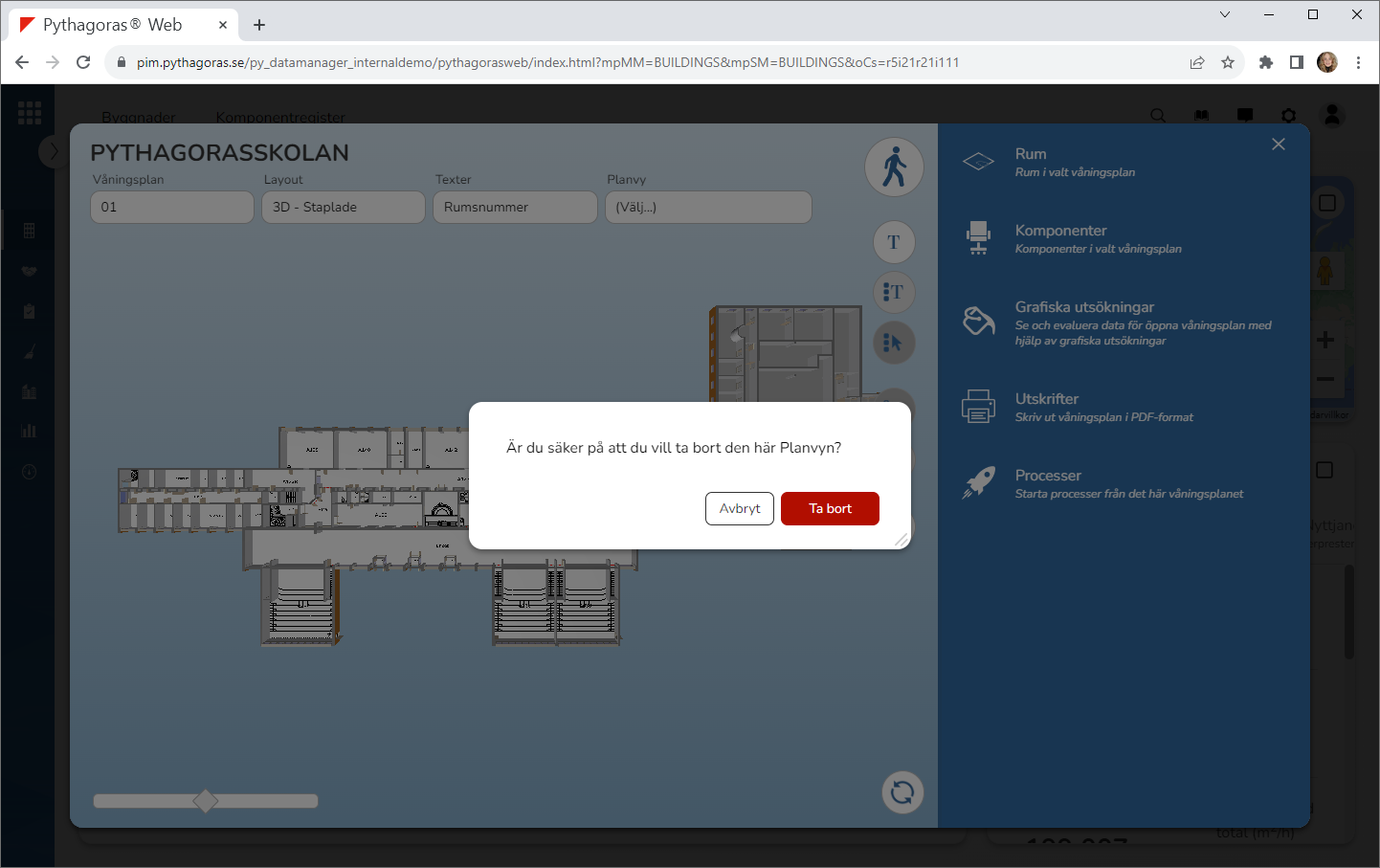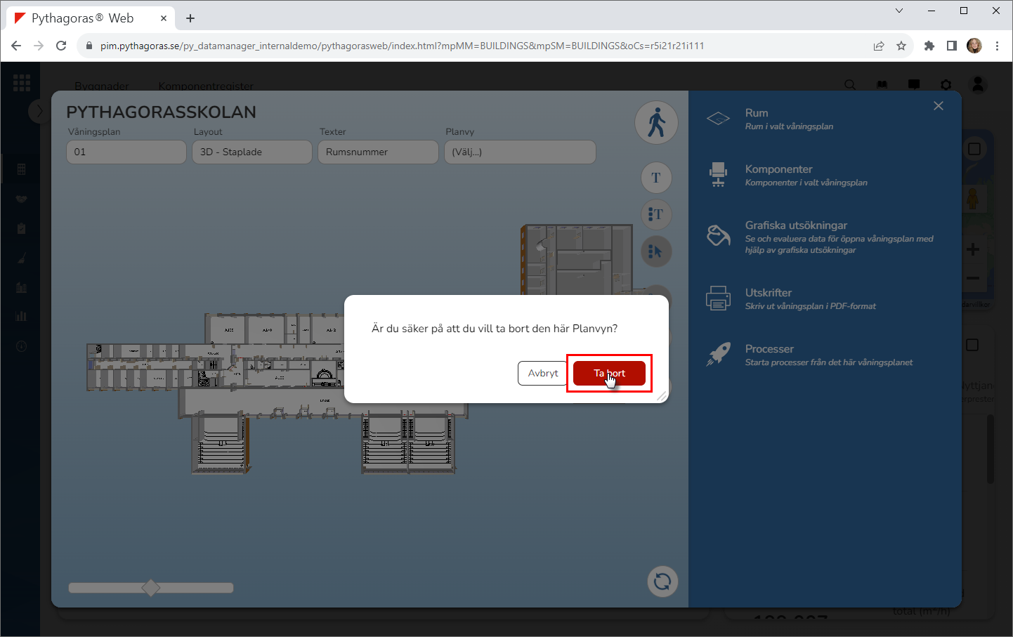 Klicka på "Ta bort" i den dialogruta du har fått tillgång till (se bilden nedan). När du klickar på "Ta bort" kommer den planvy du arbetar med att tas bort från Pythagoras webb.
