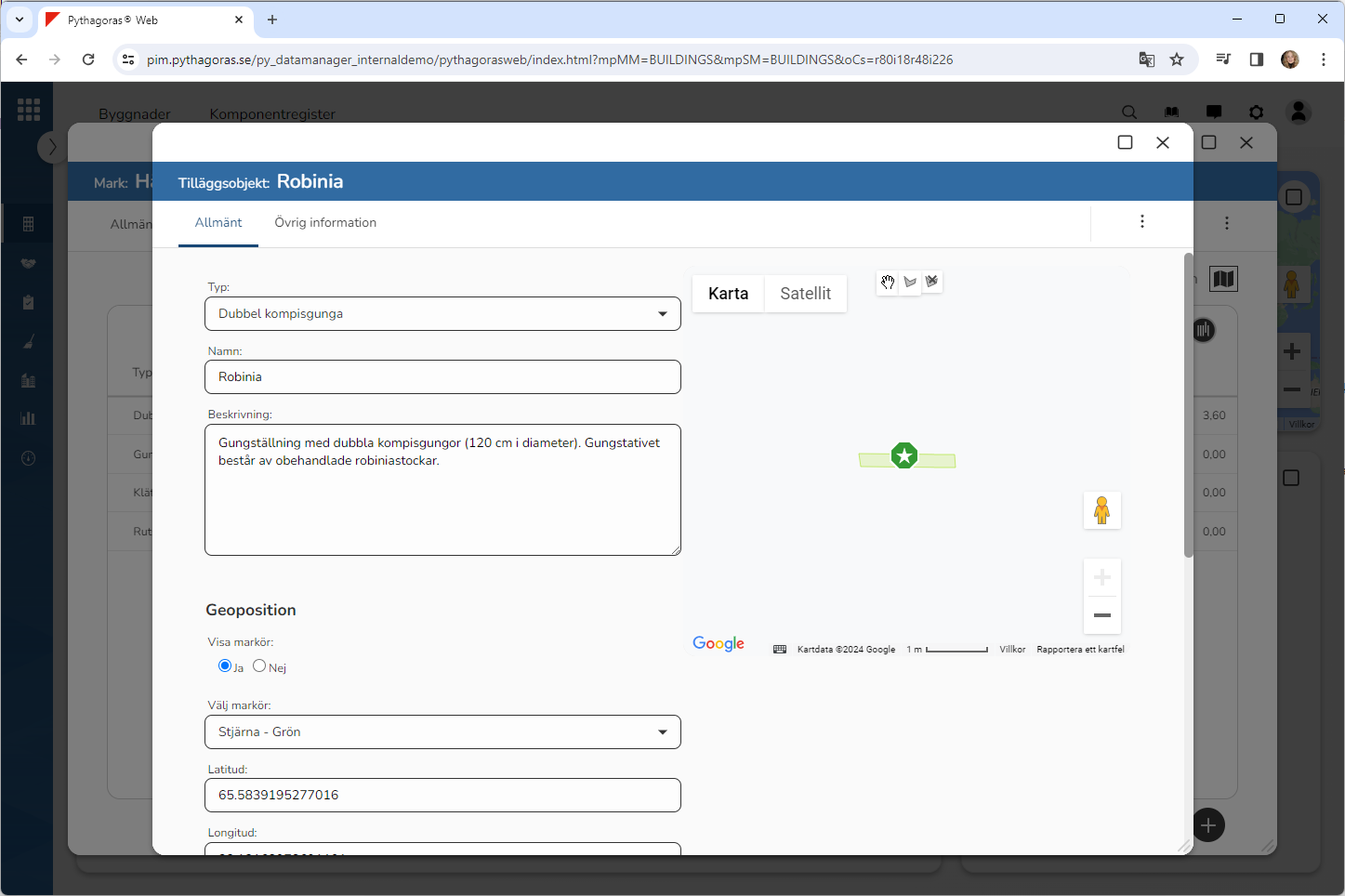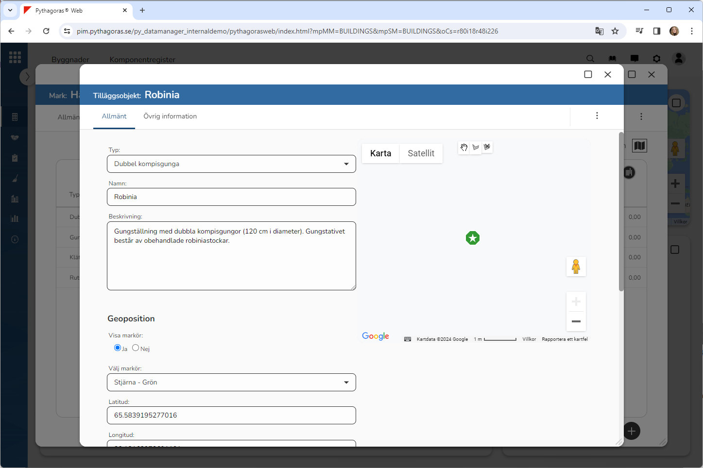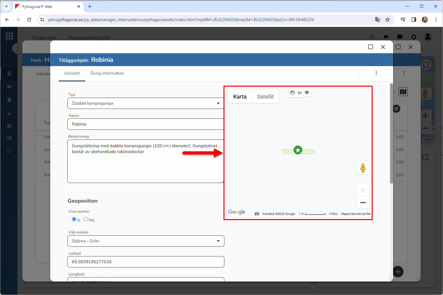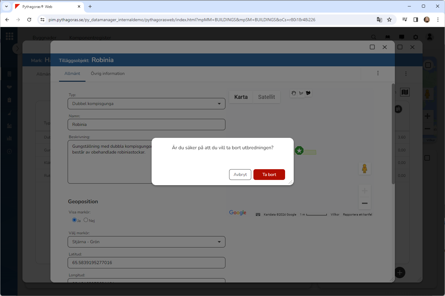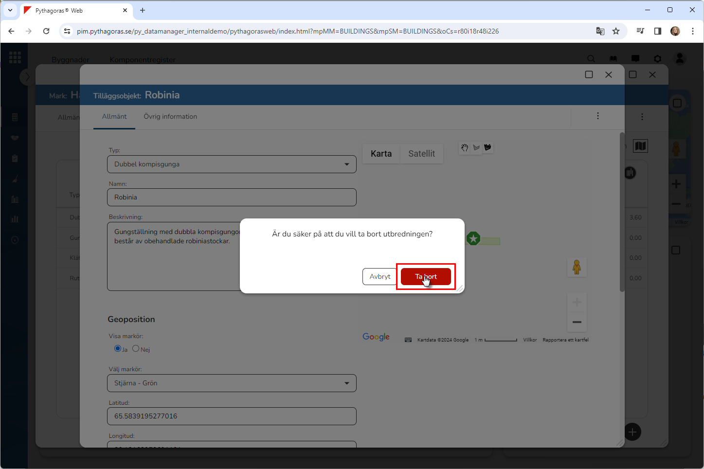 Klicka på "Ta bort" i den dialogruta du har fått tillgång till (se den första bilden nedan). När du klickar på "Ta bort" kommer den polygon som är kopplad till det tilläggsobjekt du arbetar med att tas bort från kartan (se den andra bilden nedan).