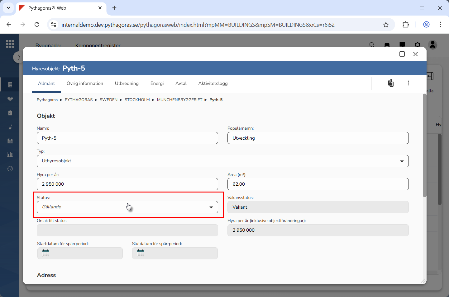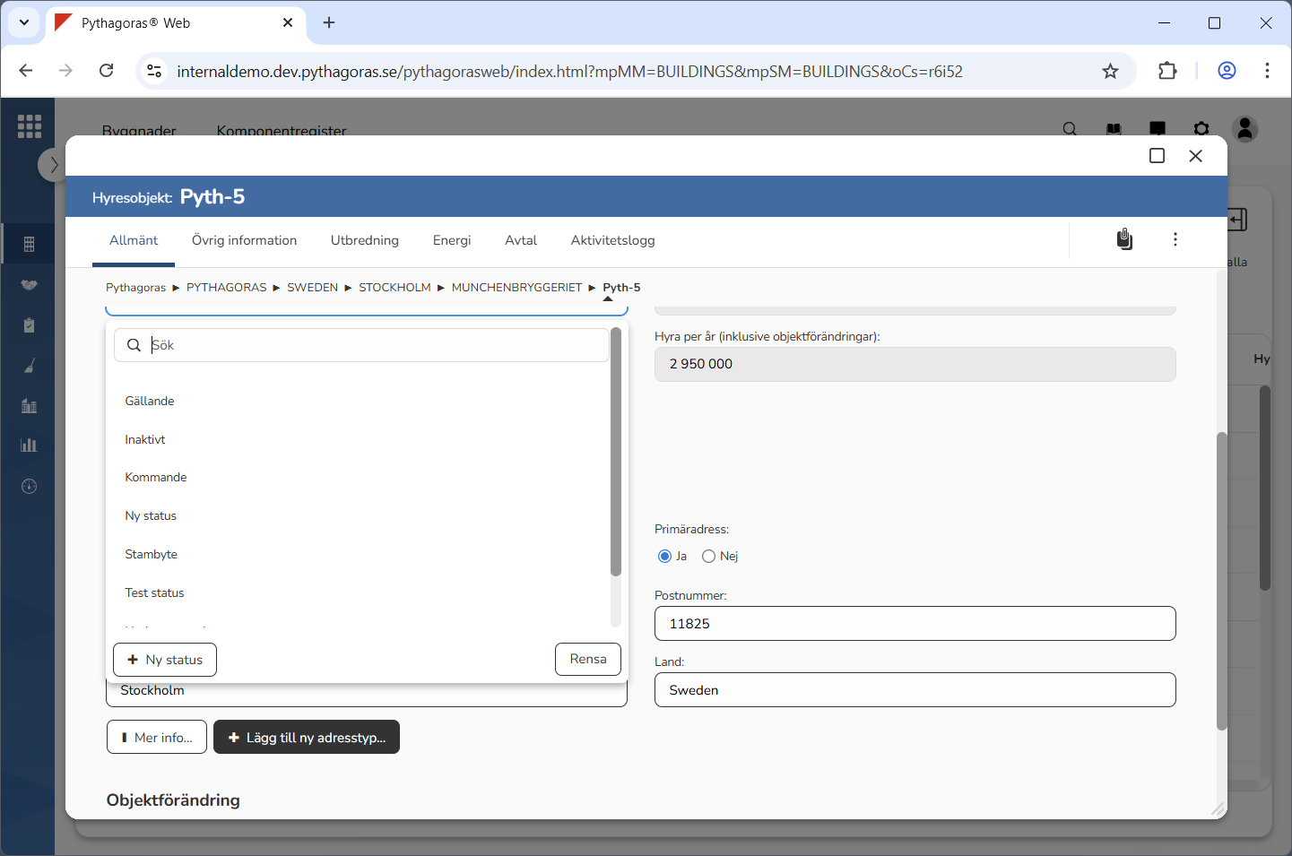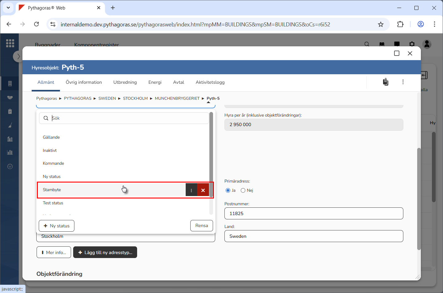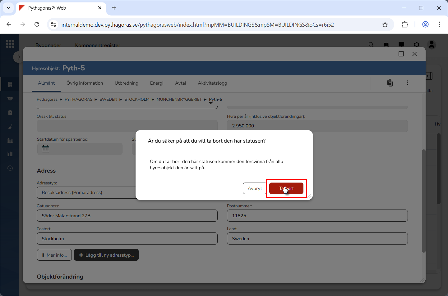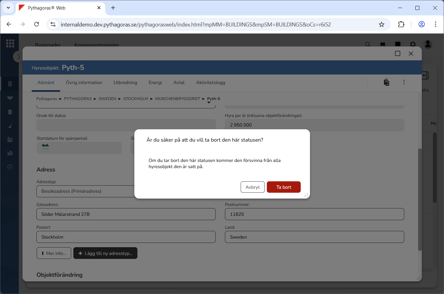 Klicka på "Ta bort" i den dialogruta du har fått tillgång till (se den första bilden nedan). När du klickar på "Ta bort" kommer den status du arbetar med att tas bort från Pythagoras webb. Detta samtidigt som du skickas tillbaka till hyresobjektskortet (se den andra bilden nedan).
