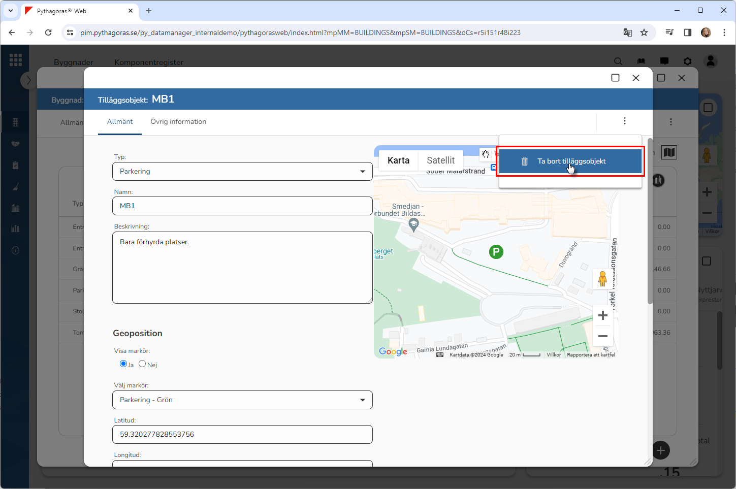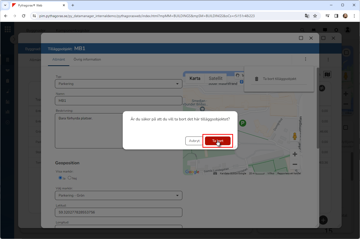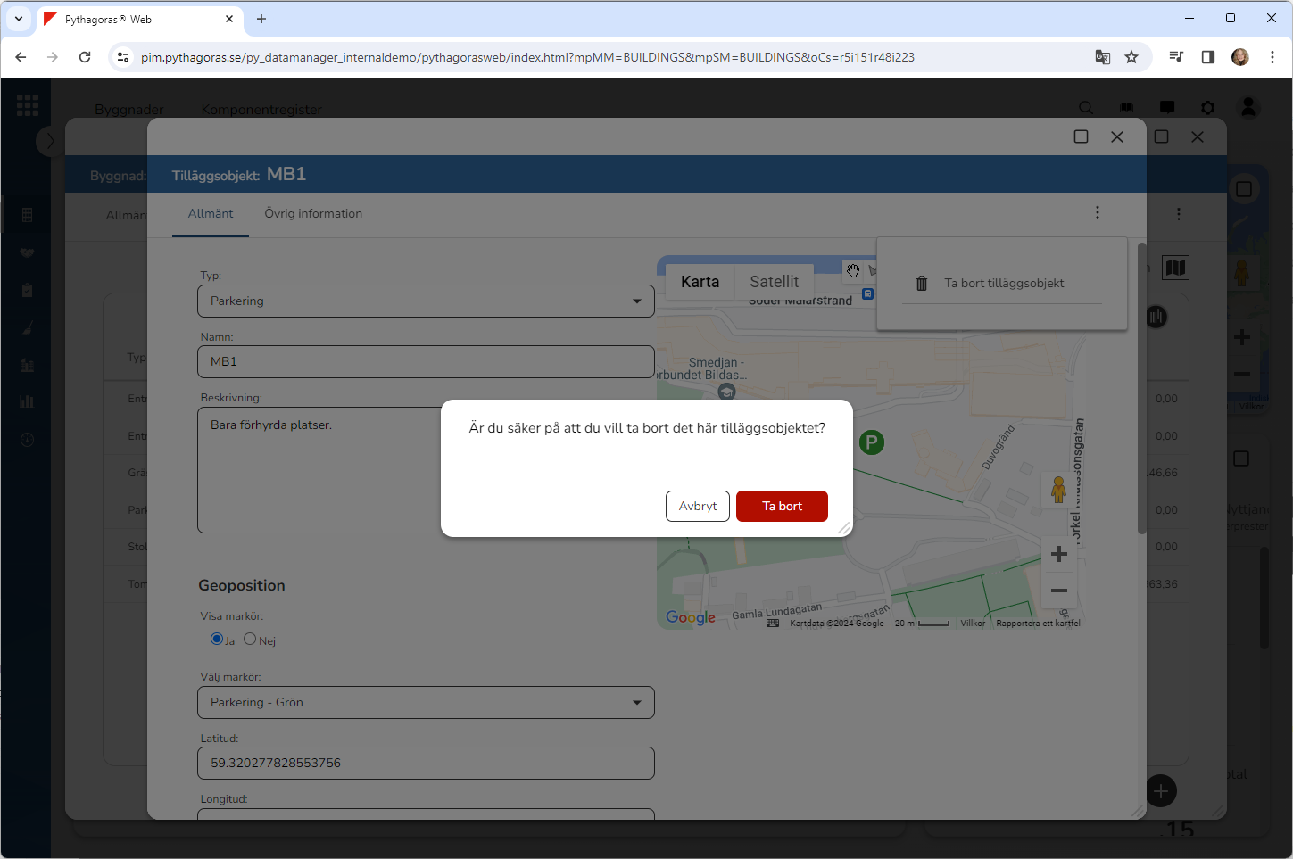 Klicka på "Ta bort" i den dialogruta du har fått tillgång till (se den första bilden nedan). När du klickar på "Ta bort" kommer det tilläggsobjekt du arbetar med att tas bort från Pythagoras webb. Detta samtidigt som du skickas tillbaka till listan med tilläggsobjekt som är kopplade till den byggnad du arbetar med (se den andra bilden nedan).