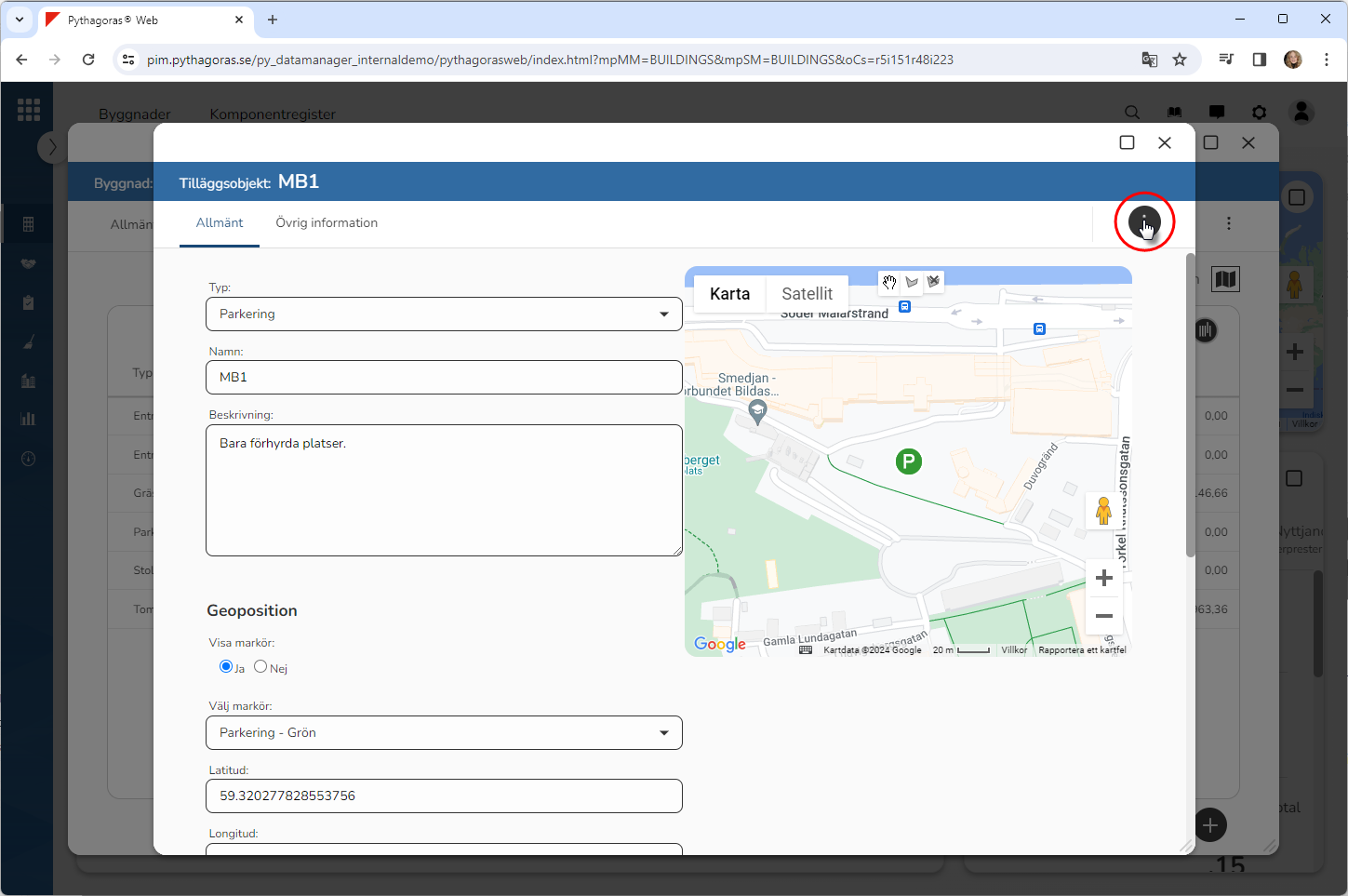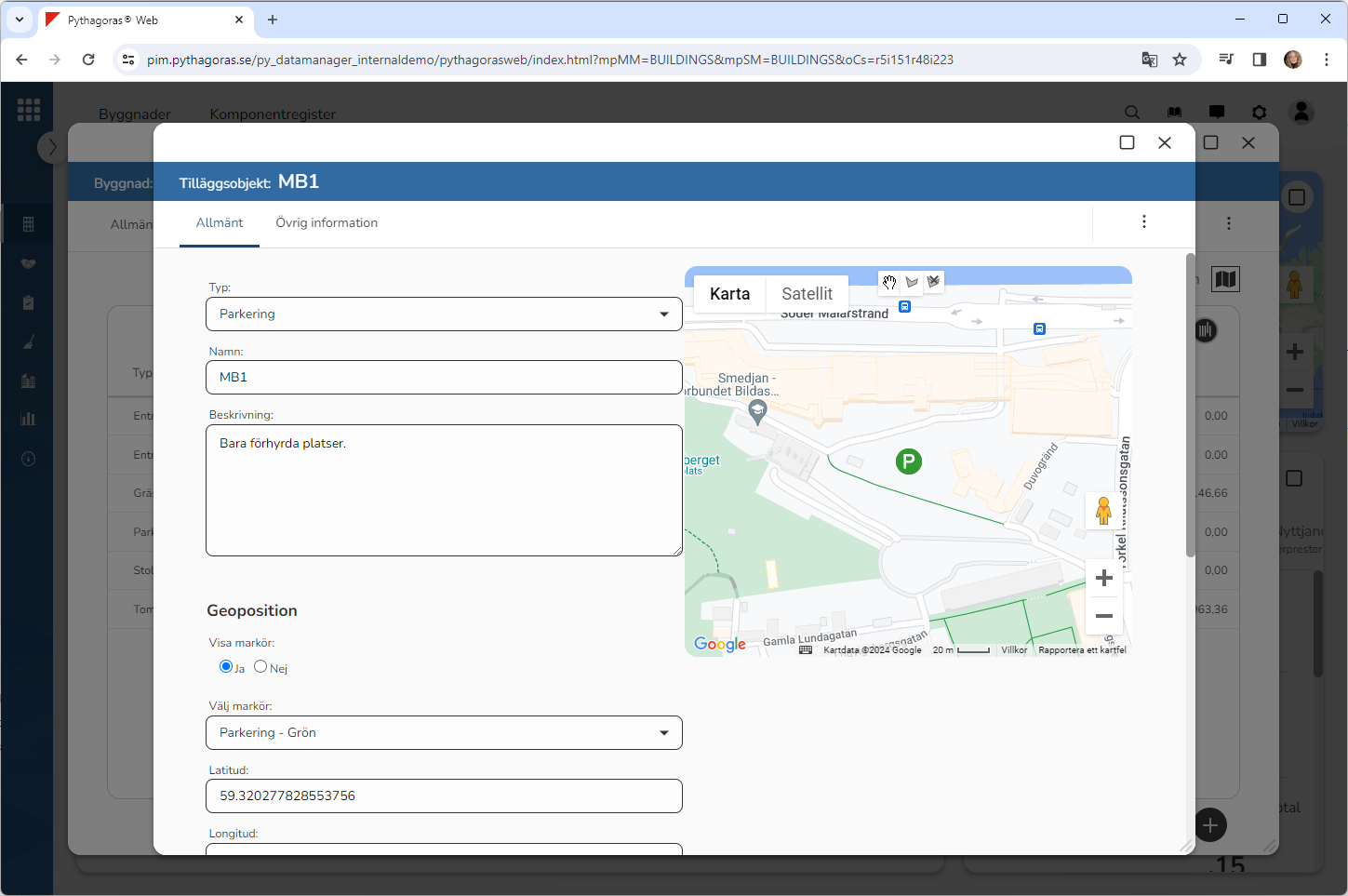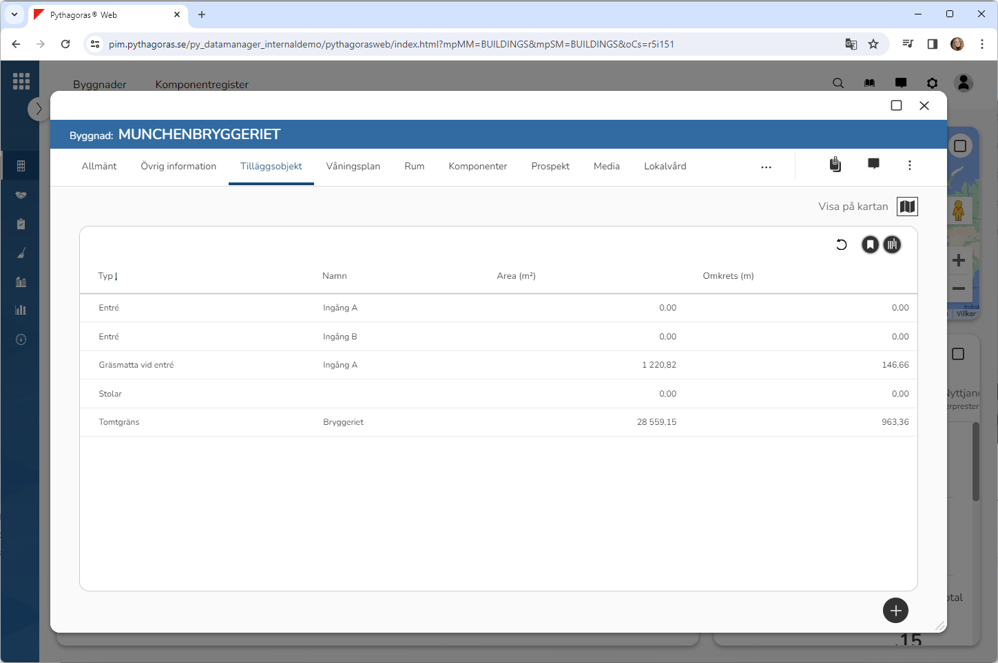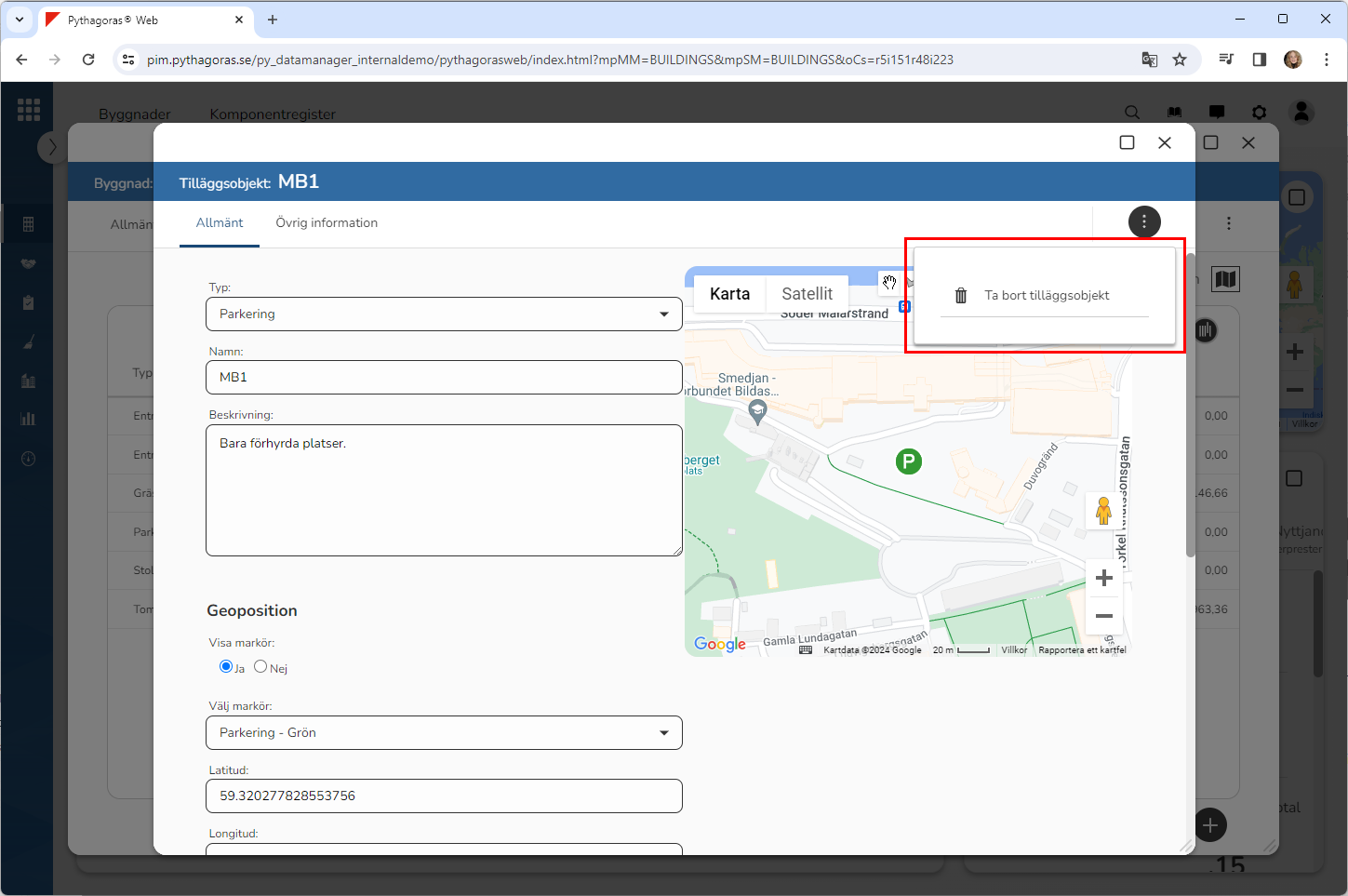 Klicka på "Ta bort" i den dialogruta du har fått tillgång till (se den första bilden nedan). När du klickar på "Ta bort" kommer det tilläggsobjekt du arbetar med att tas bort från Pythagoras webb. Detta samtidigt som du skickas tillbaka till listan med tilläggsobjekt som är kopplade till den byggnad du arbetar med (se den andra bilden nedan).