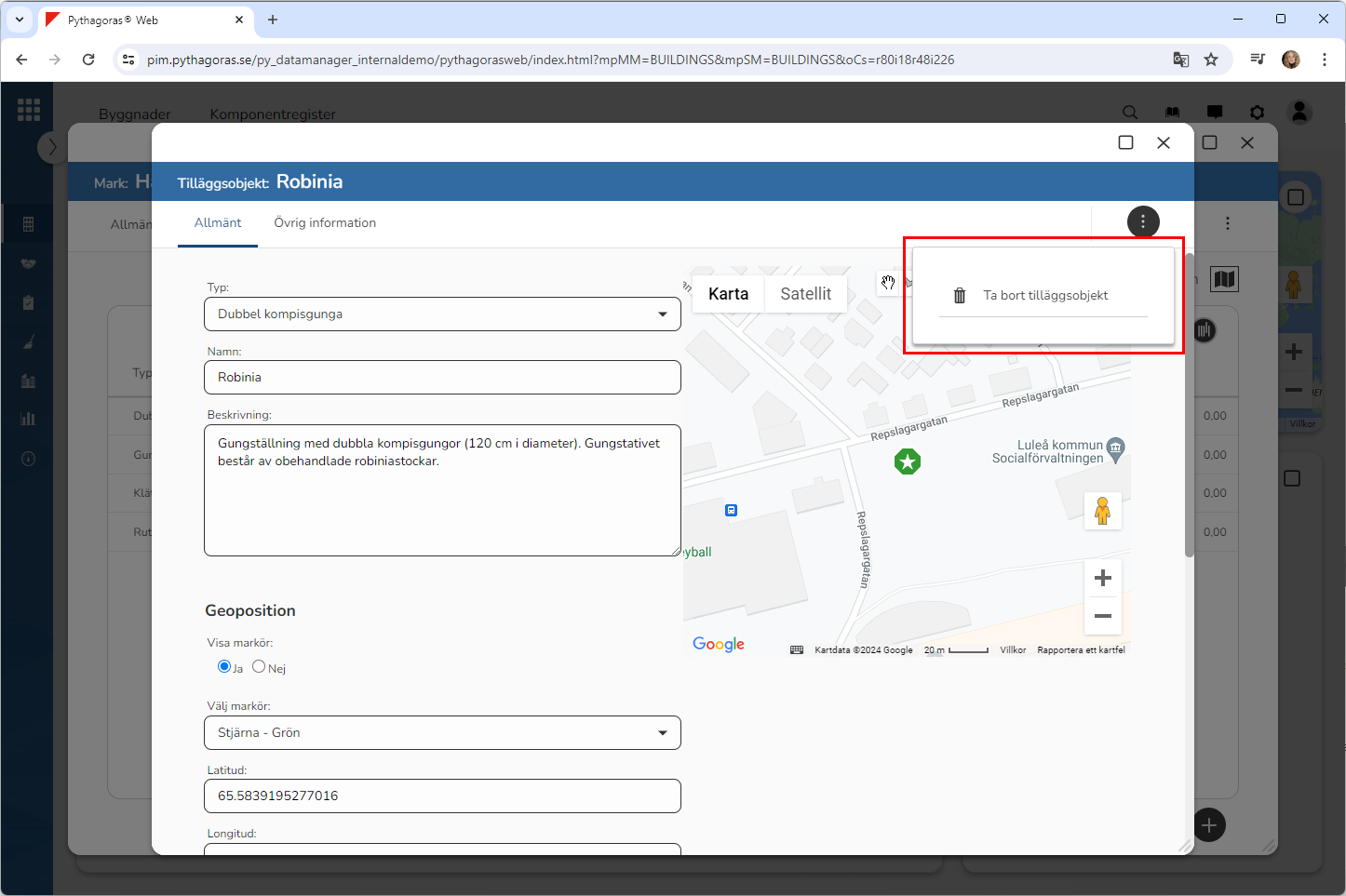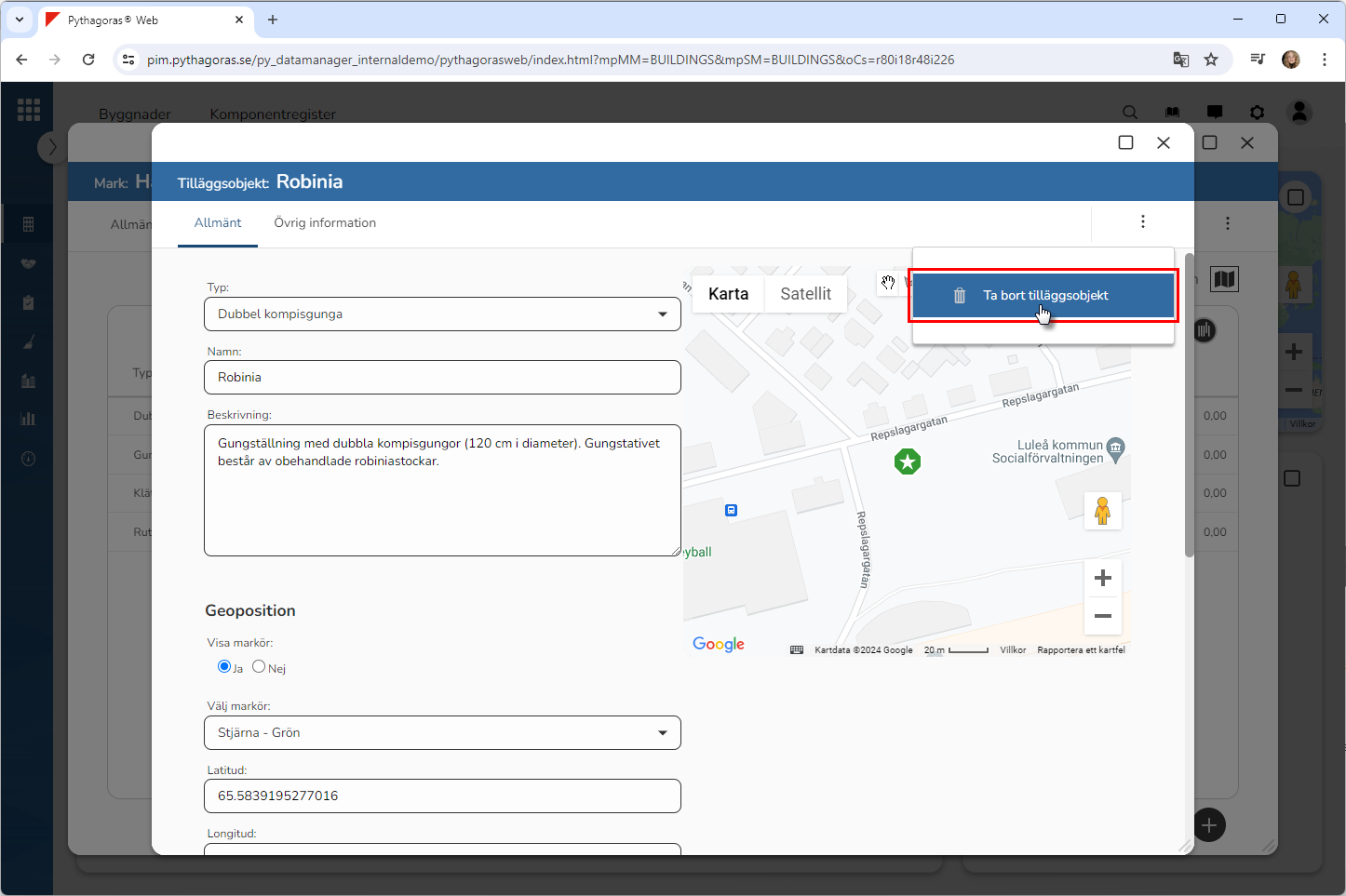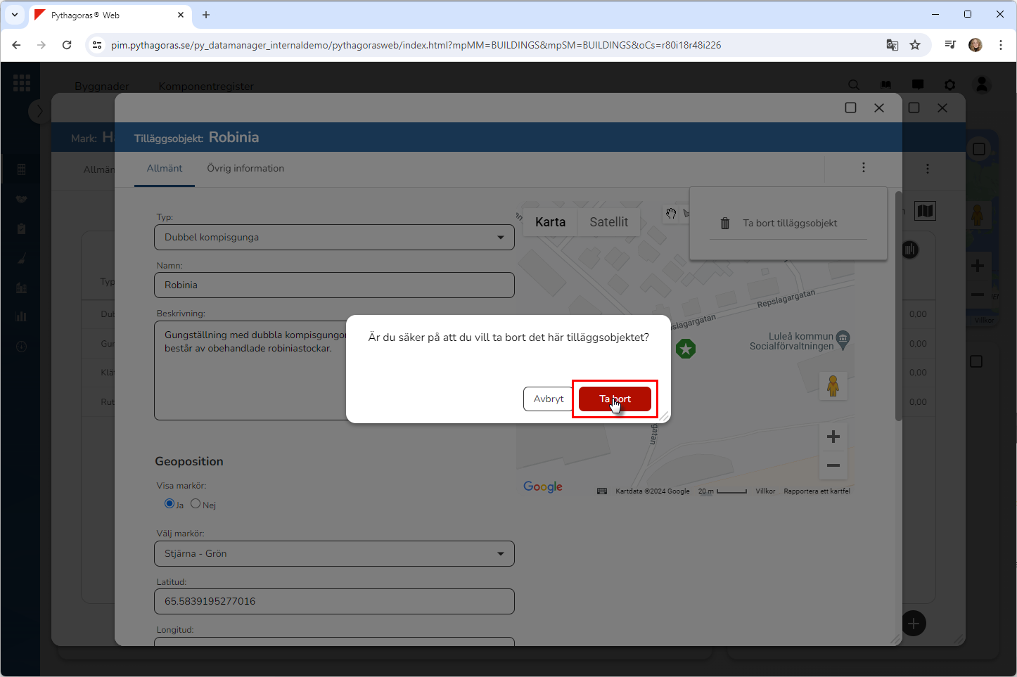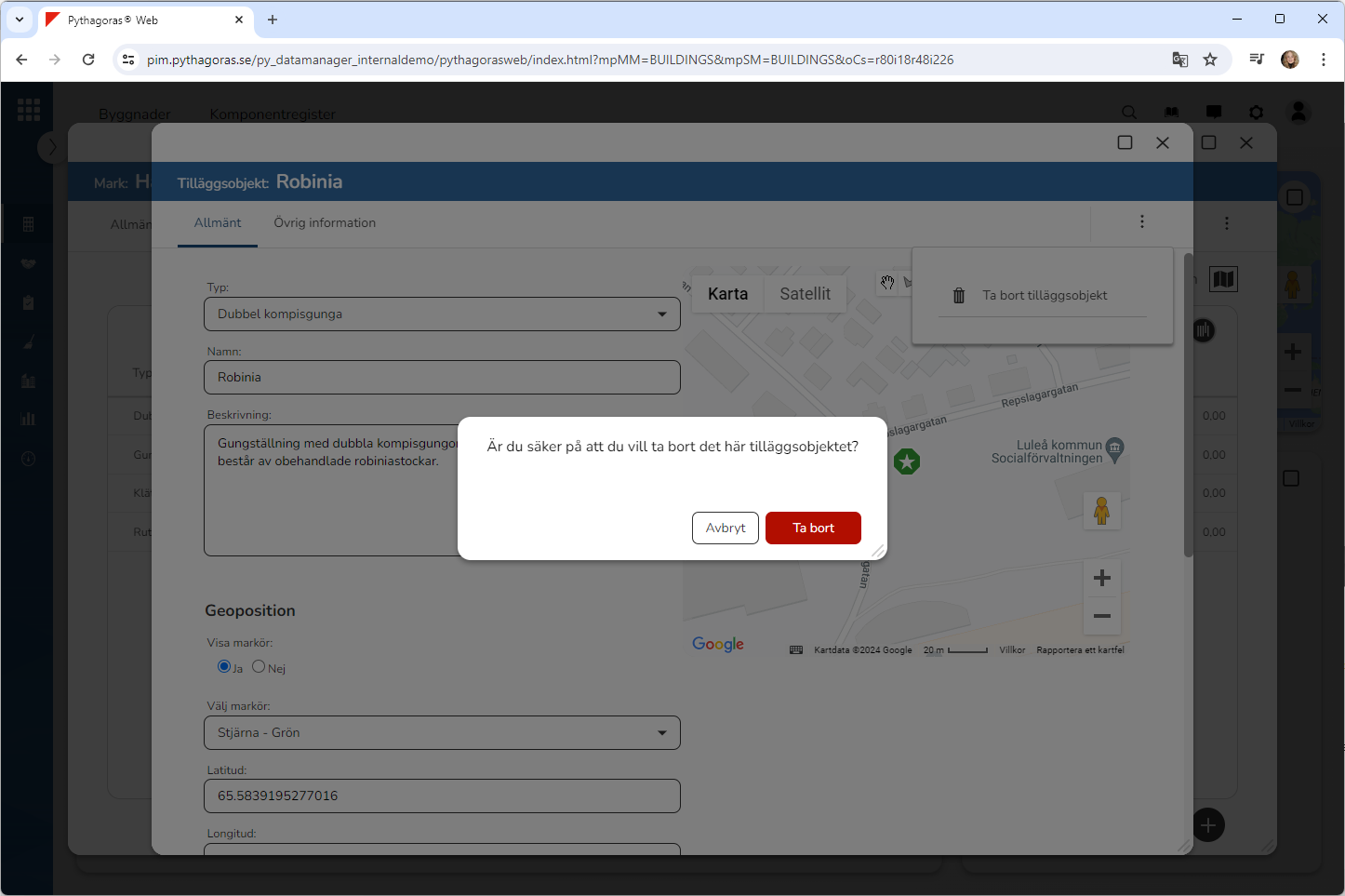Klicka på "Ta bort" i den dialogruta du har fått tillgång till (se den första bilden nedan). När du klickar på "Ta bort" kommer det tilläggsobjekt du arbetar med att tas bort från Pythagoras webb. Detta samtidigt som du skickas tillbaka till listan med tilläggsobjekt som är kopplade till det markobjekt du arbetar med (se den andra bilden nedan).