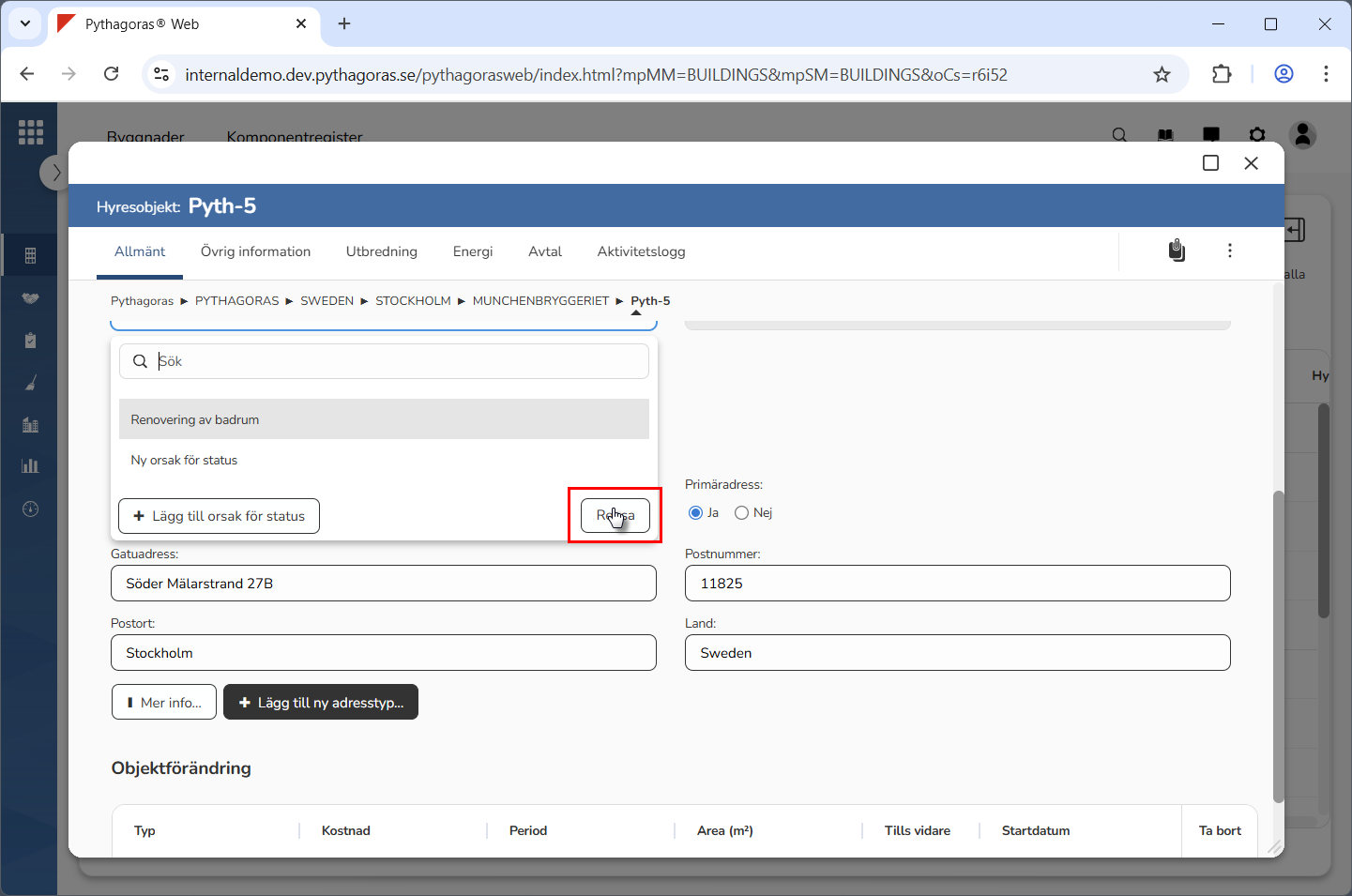 Ta bort orsaken till statusen från det hyresobjekt du arbetar med. Klicka i fältet med namnet "Orsak till status". Klicka sedan på knappen med namnet "Rensa" i den lista du får tillgång till (se bilderna nedan).