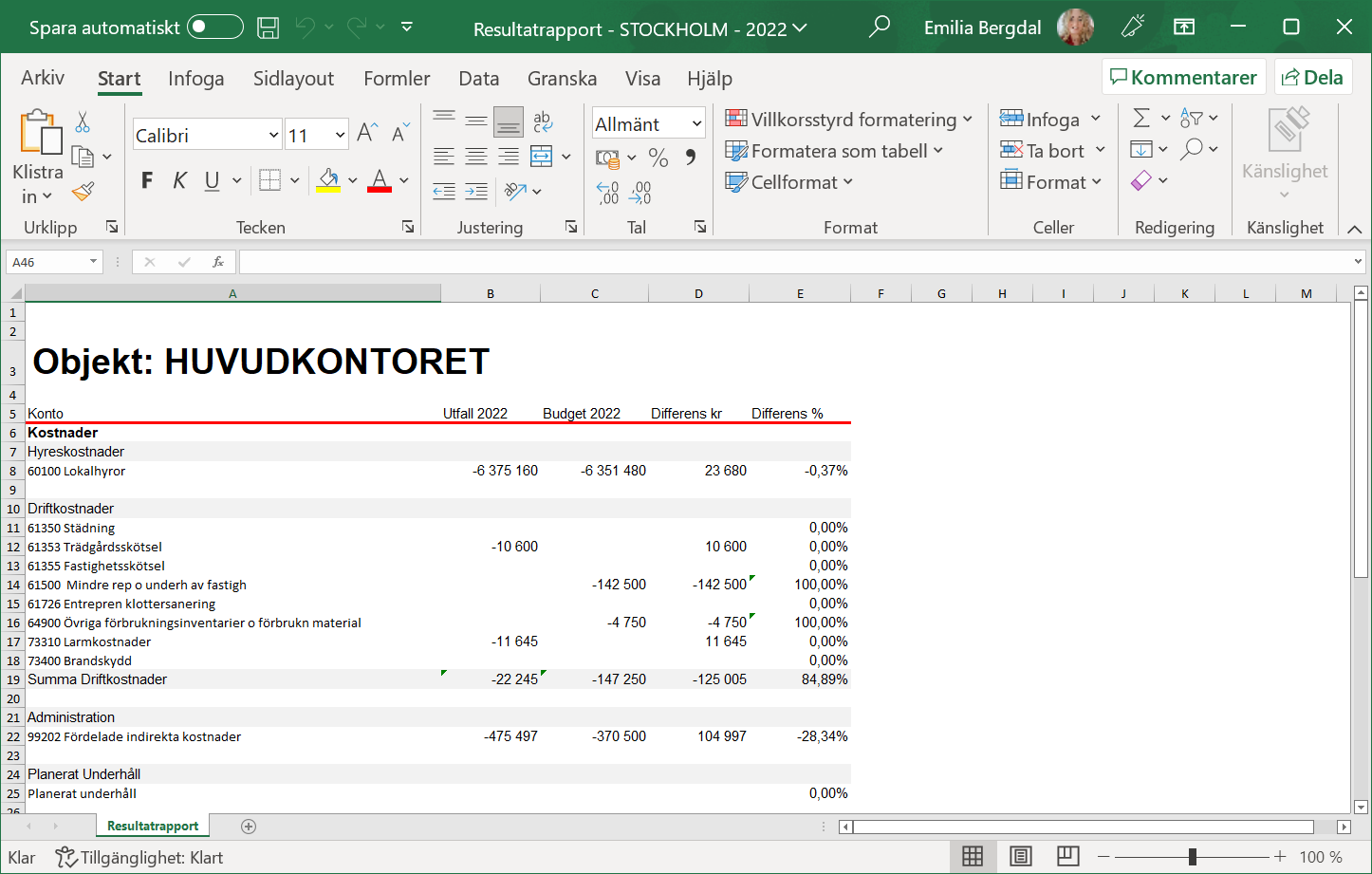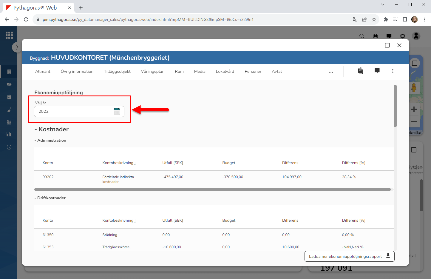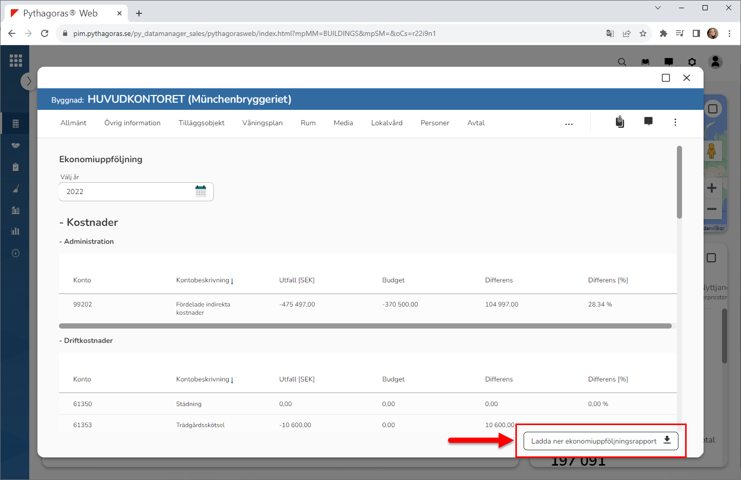 Klicka på knappen med namnet "Ladda ner ekonomiuppföljningsrapport" (se den första bilden nedan). När du klickar på knappen med namnet "Ladda ner ekonomiuppföljningsrapport" kommer en ekonomiuppföljningsrapport som visar utfall och budgeterade kostnader och intäkter för olika konton i den byggnad du arbetar med att tas ut (se den andra bilden nedan).