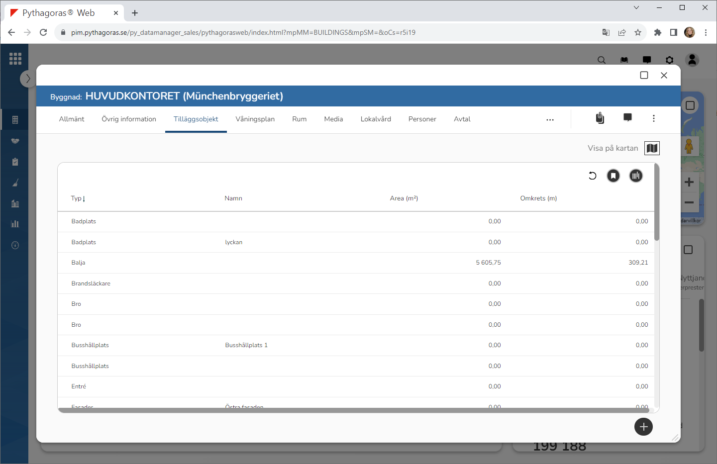 Under fliken med namnet "Tilläggsobjekt" hittar du en lista med tilläggsobjekt som är kopplade till en byggnad (se bilden nedan). I listan med tilläggsobjekt hittar du ett antal kolumner. Vilka kolumner du hittar i listan med tilläggsobjekt beror på vilken vy som visas i den.