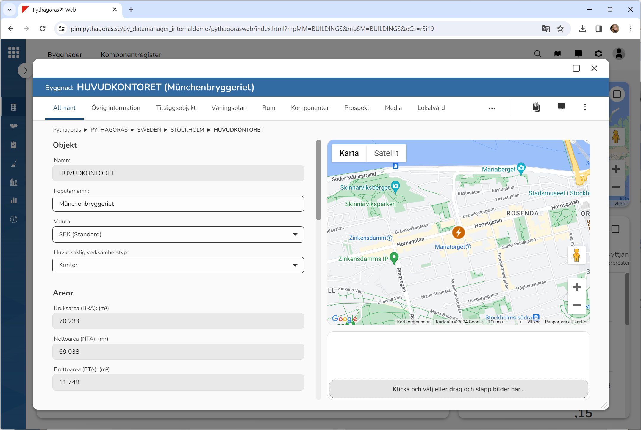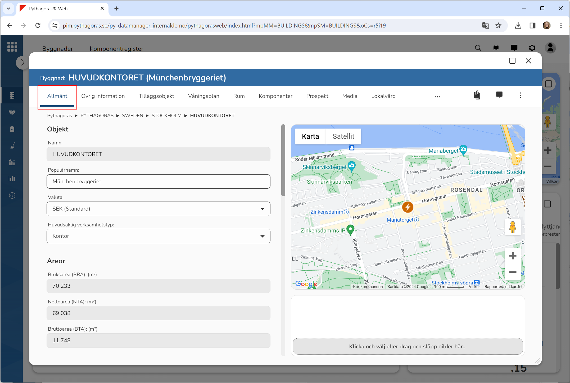 Öppna den byggnad vars geoposition du vill uppdatera. För mer information om hur du öppnar en byggnad, se avsnitt 4.6.1., 5.4.3. eller 6.1.1.