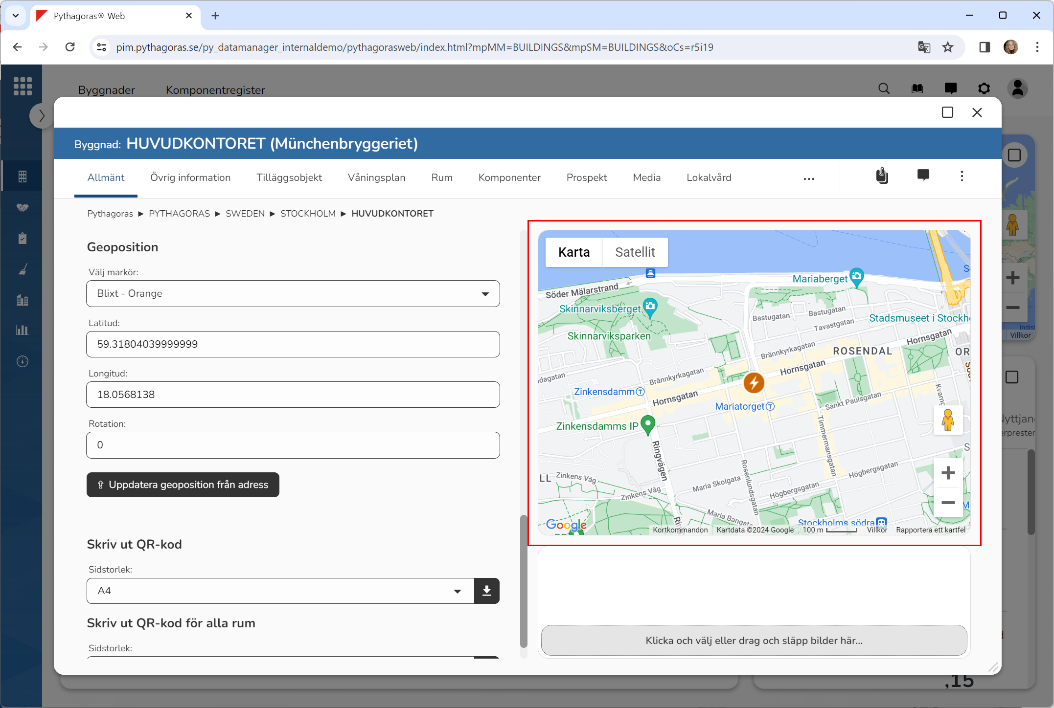 Klicka på knappen med namnet "Uppdatera geoposition från adress" (se den första bilden nedan). När du klickar på knappen med namnet "Uppdatera geoposition från adress" kommer geopositionen för den byggnad du arbetar med att uppdateras. När geopositionen för en byggnad uppdateras flyttas dess kartmarkör för kartan (se den andra bilden nedan). Obs! Samtidigt som geopositionen för en byggnad uppdateras, uppdateras även informationen i fälten med namnet "Latitud" och "Longitud".