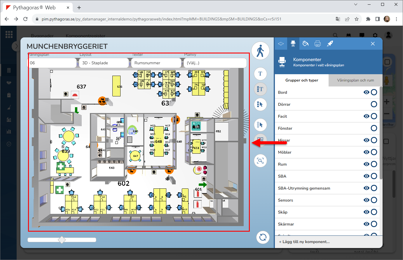 Välj en eller fler komponenter. Detta genom att klicka på en eller fler komponenter i modellen. Notera att den eller de komponenter du väljer markeras med rött i modellen och utsökningsfältet (se bilden nedan).