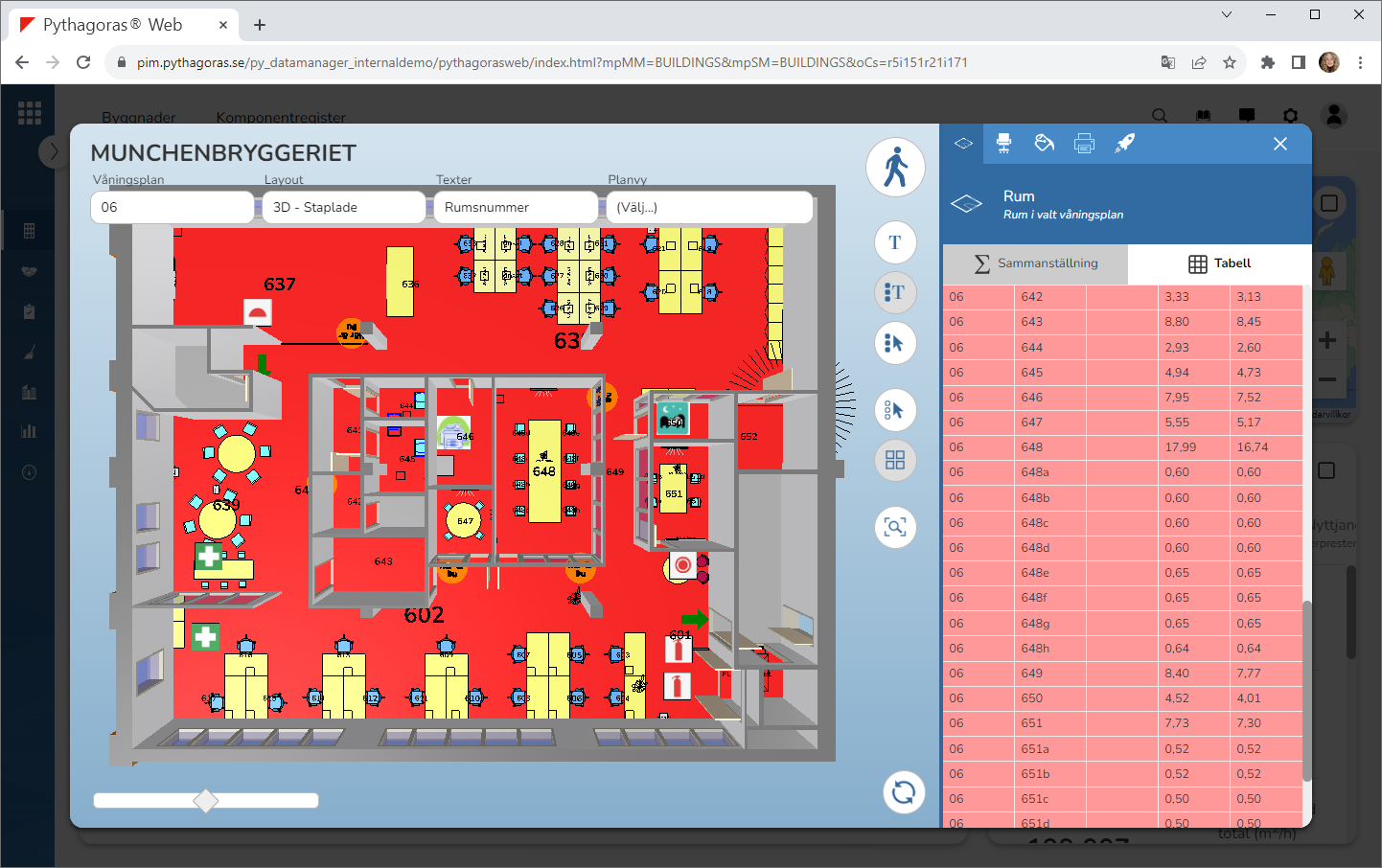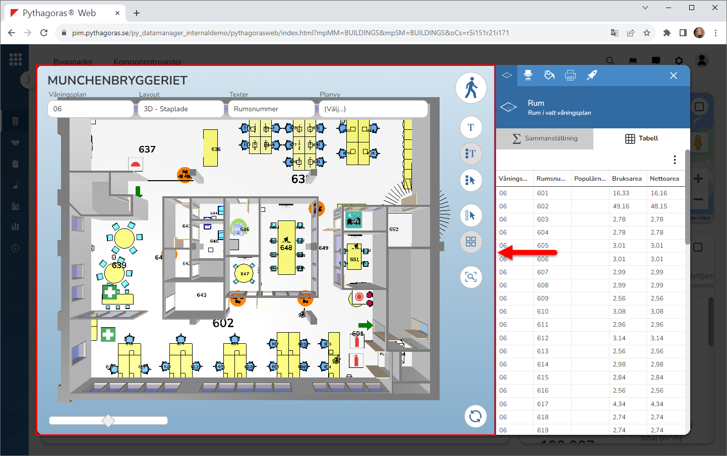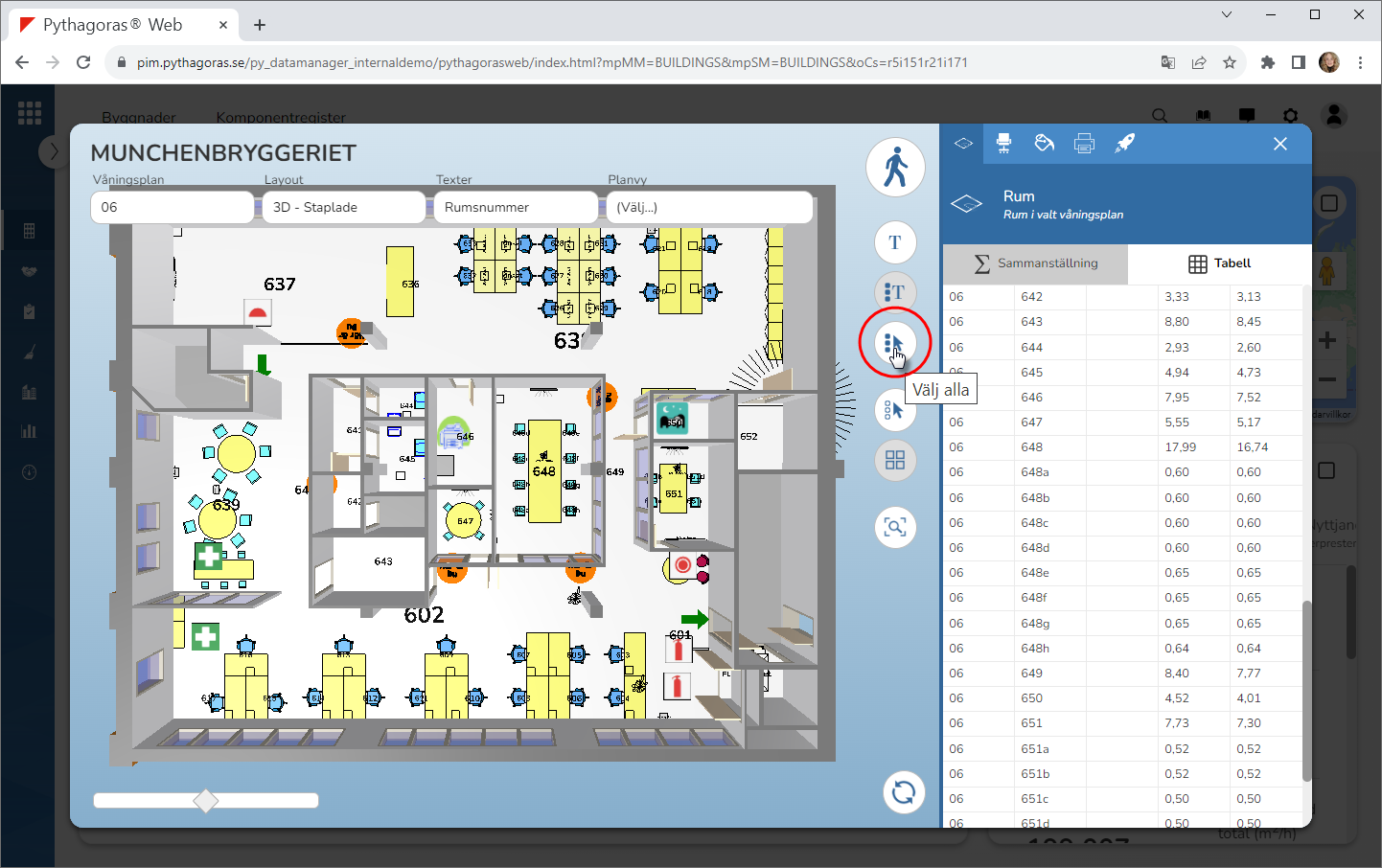 Klicka på ikonen med namnet "Välj alla" (se den första bilden nedan). När du klickar på ikonen med namnet "Välj alla" kommer alla rum som är tillgängliga i modellen att väljas och markeras med rött i modellen och utsökningsfältet (se den andra bilden nedan).