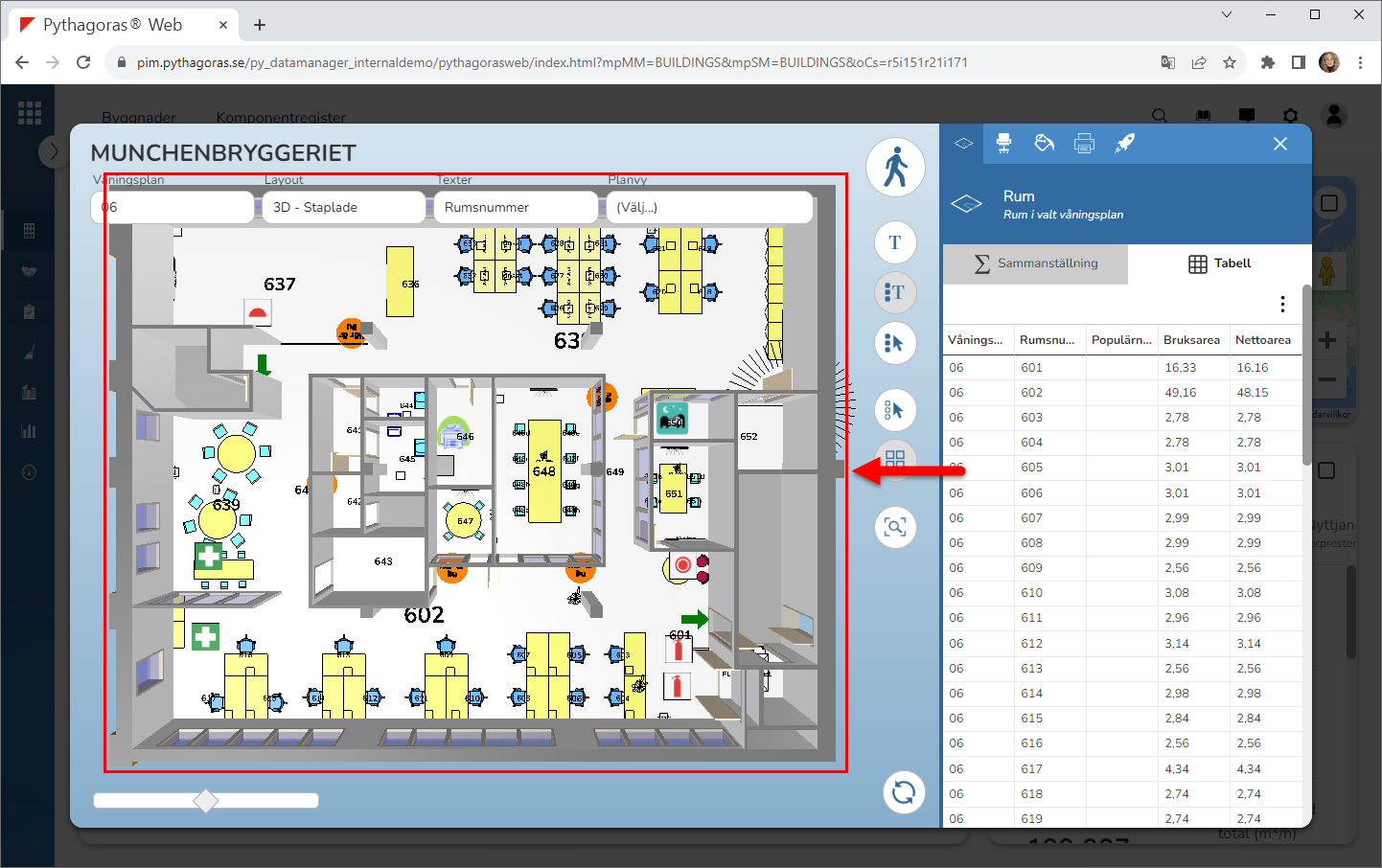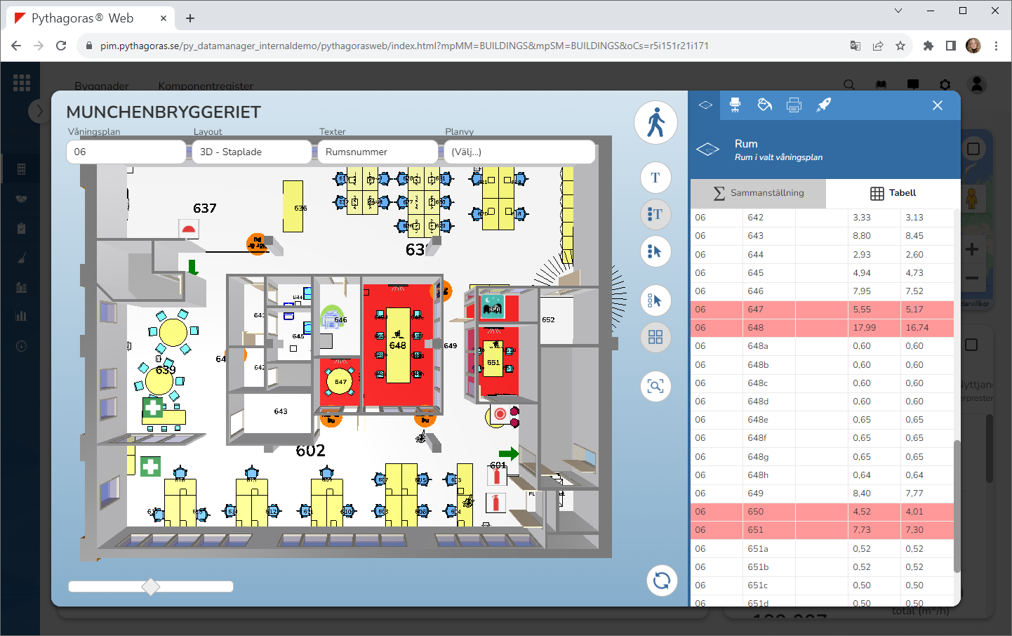 Välj ett eller fler rum. Detta genom att klicka på ett eller fler rum i modellen. Notera att det eller de rum du väljer markeras med rött i modellen och utsökningsfältet (se bilden nedan).