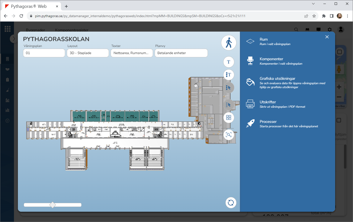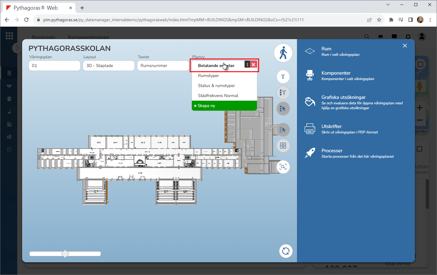 Placera din muspekare i fältet med namnet "Planvy" (se den första bilden nedan). När du placerar din muspekare i fältet med namnet "Planvy" får du tillgång till en lista med planvyer som är tillgängliga i Pythagoras webb (se den andra bilden nedan).