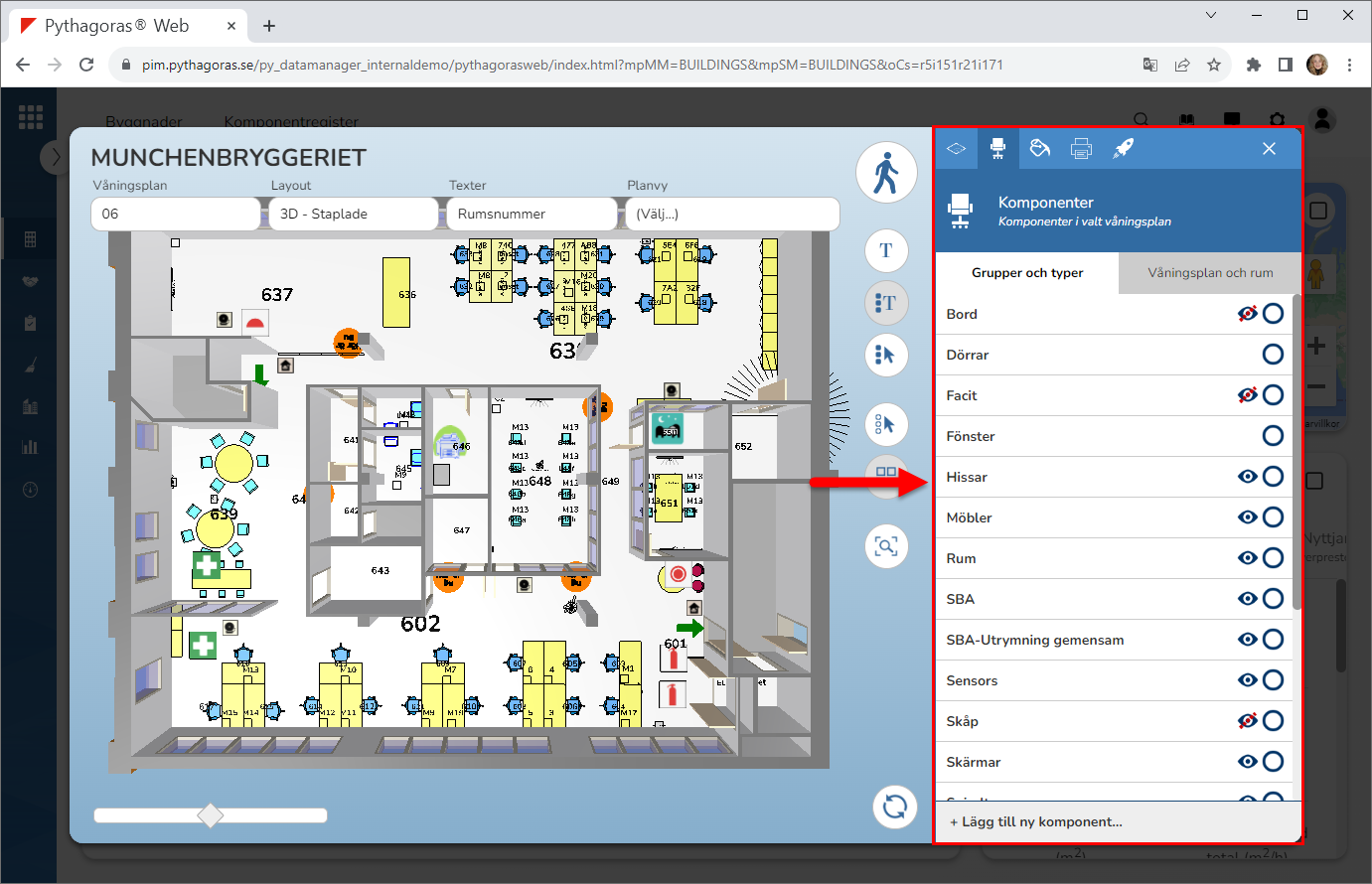 Visa komponenter via fliken med namnet "Våningsplan och rum"