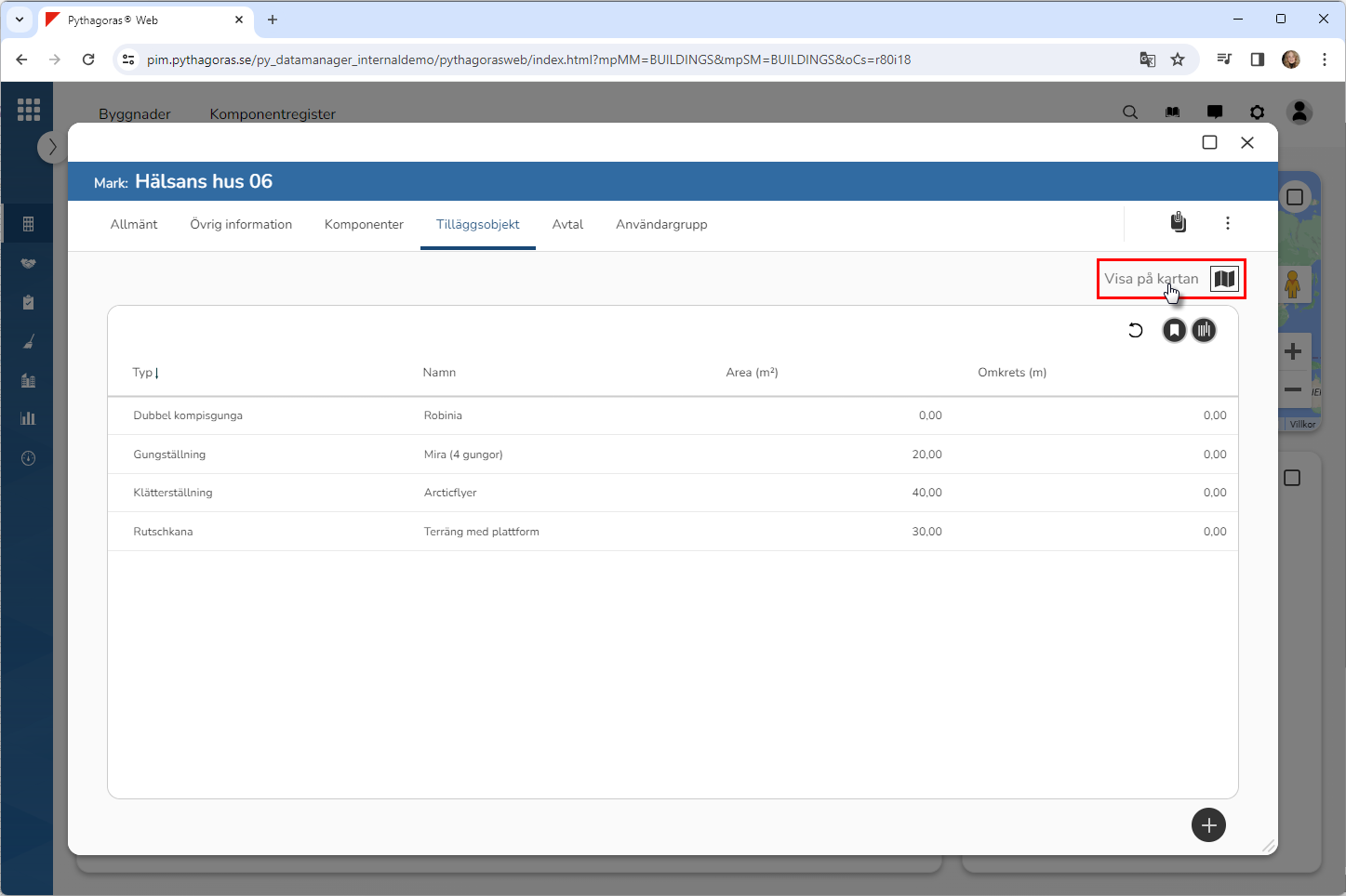 Klicka på "Visa på kartan" (se den första bilden nedan). När du klickar på "Visa på kartan" får du tillgång till en karta som visar de tilläggsobjekt som är kopplade till det markobjekt du arbetar med (se den andra bilden nedan).