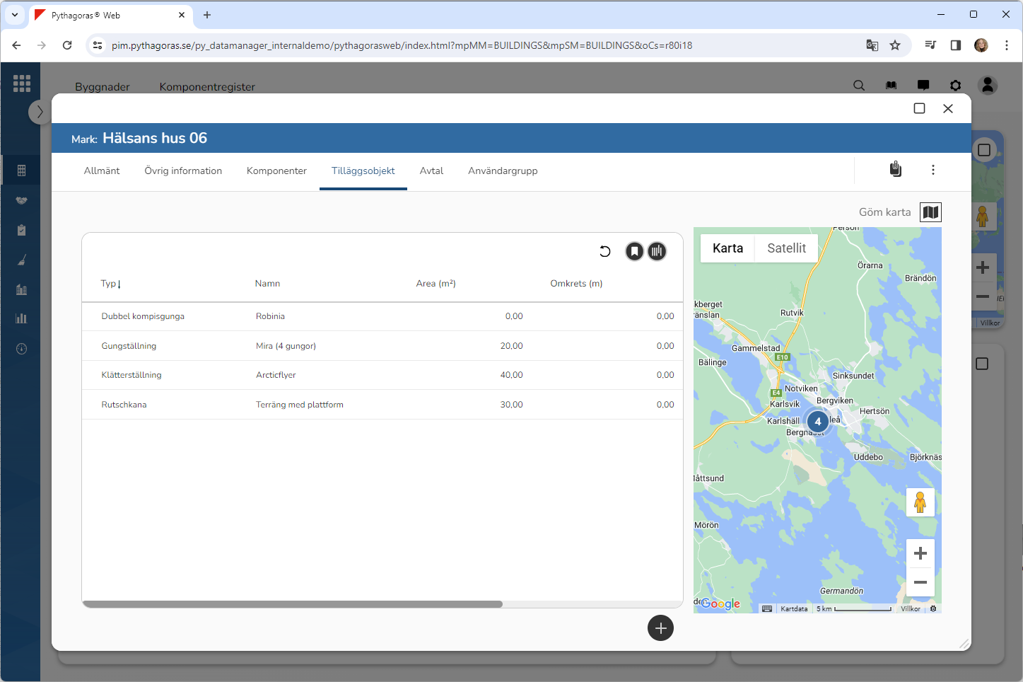 Ställ dig på fliken med namnet "Tilläggsobjekt" (se bilden nedan). Under fliken med namnet "Tilläggsobjekt" hittar du en lista med tilläggsobjekt som är kopplade till det markobjekt du arbetar med.