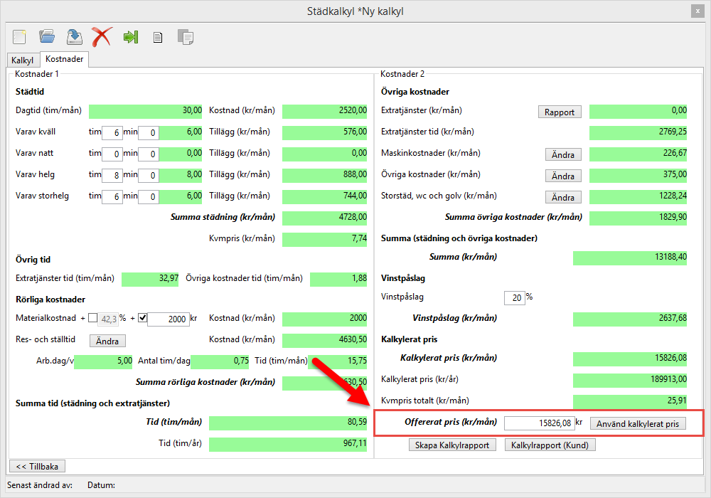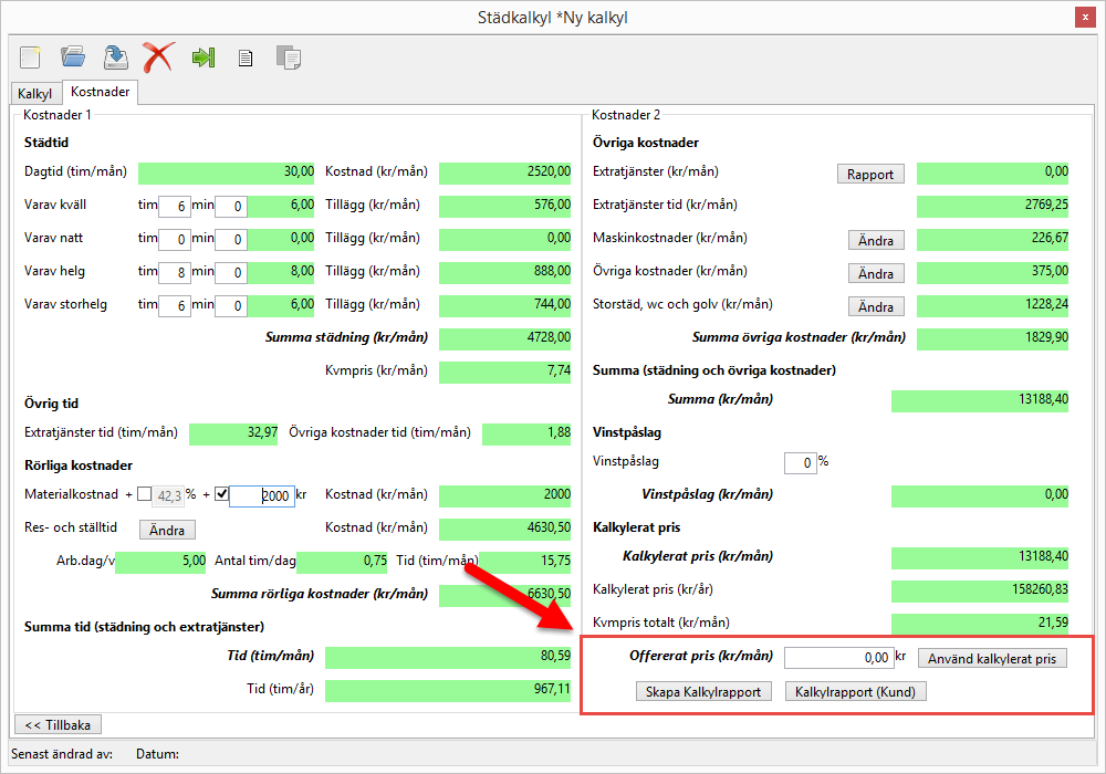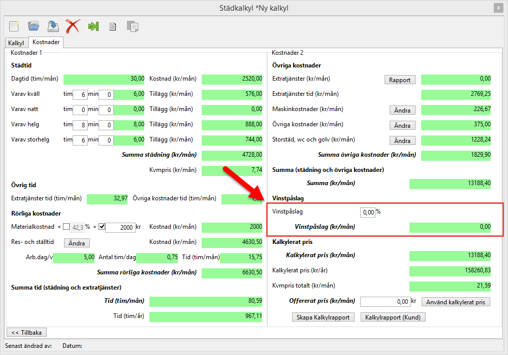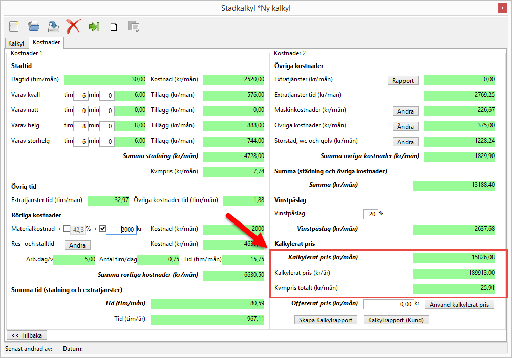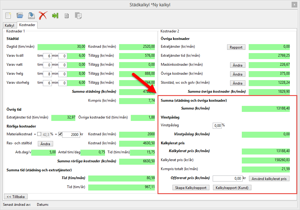 Om alla kalkylfält som inledningsvis var röda nu är gröna är du nu färdig med din kalkyl vilket innebär att du kan spara den. För mer information om hur du sprar din kalkyl, gå till avsnitt 2.2.1.1. Städkalkylens knappar och läs där vidare under rubriken Spara städkalkyl.