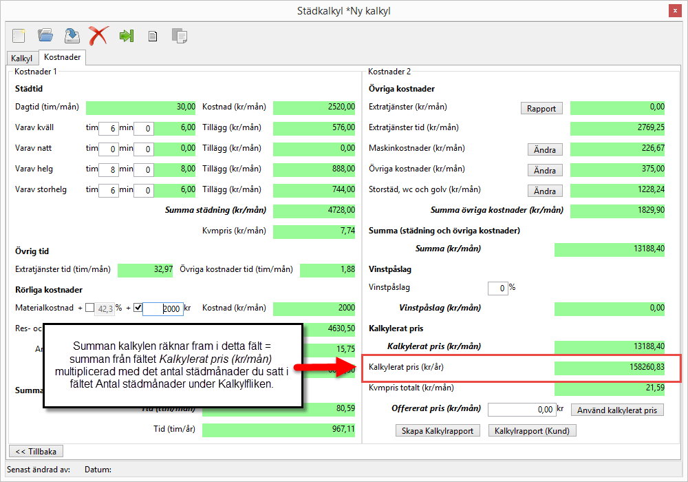 I fältet Kalkylerat pris (kr/år) räknar kalkylen fram en summa genom att multiplicera summan från fältet Kalkylerat pris (kr/mån) med det antal städmånader du angett i fältet Antal städmånader under rubriken Städdata (från SpaceManager) under Kalkylfliken (se bilden nedan).