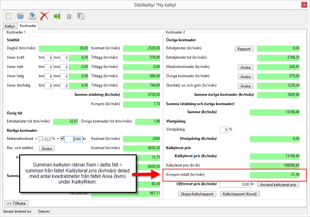 I fältet Kvmpris totalt (kr/mån) räknar kalkylen fram det totala kvadratmeterpriset per månad genom att dela summan från fältet Kalkylerat pris (kr/mån) med antalet kvadratmeter från fältet Area (kvm) under rubriken Städdata (från SpaceManager) under Kalkylfliken (se bilden nedan).