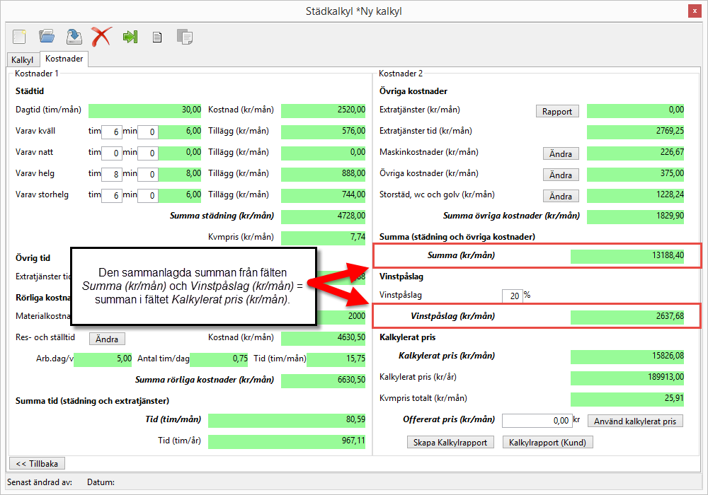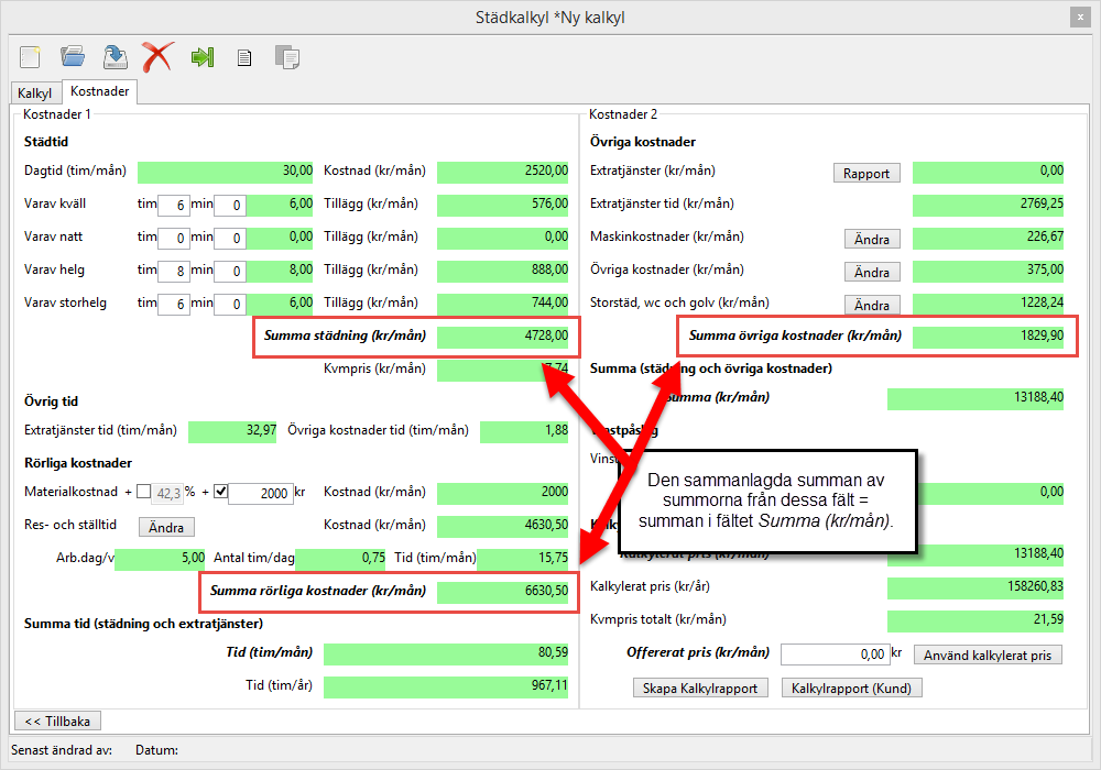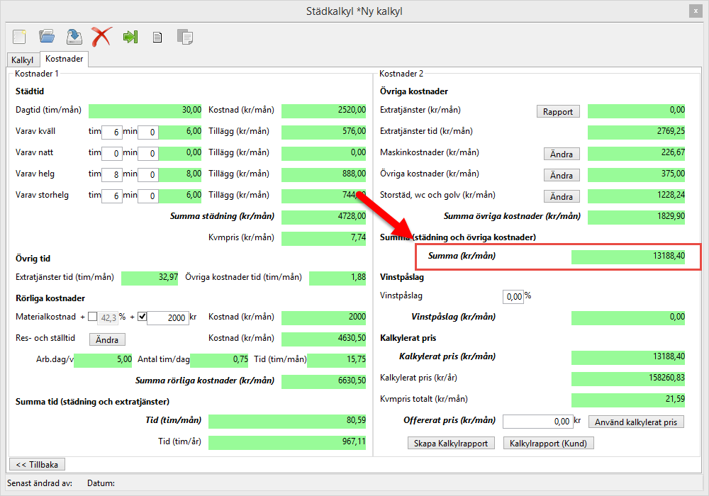 I fältet Summa (kr/mån) ser du den sammanlagda summan från fälten Summa städning (kr/mån) och Summa rörliga kostnader (kr/mån) från Kostnader 1 samt fältet Summa övriga kostnader (kr/mån) från Kostnader 2 (se bilderna nedan).