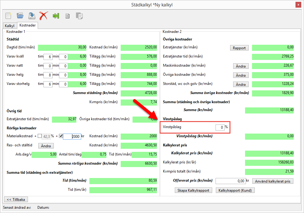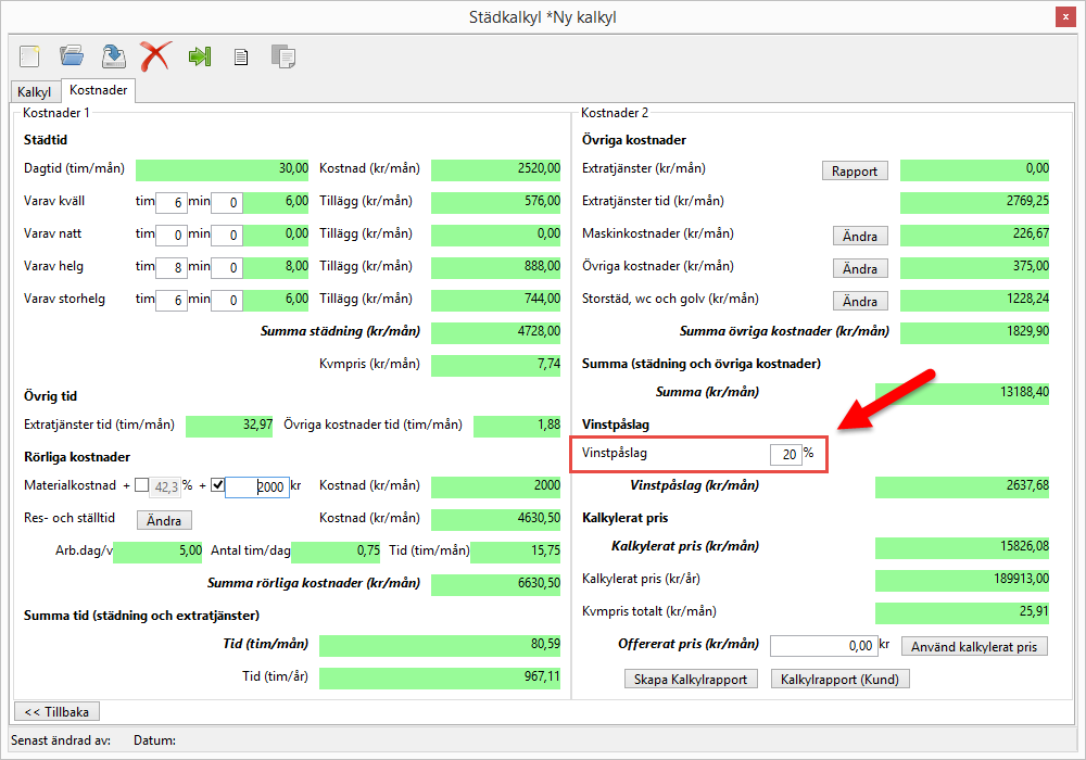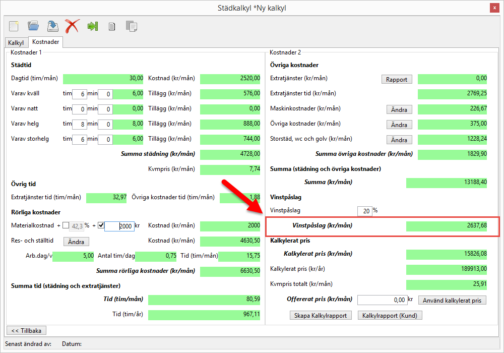 I fältet Kalkylerat pris (kr/mån) räknar kalkylen fram den sammanlagda summan från fälten Summa (kr/mån) och Vinstpåslag (kr/mån) (se bilderna nedan).