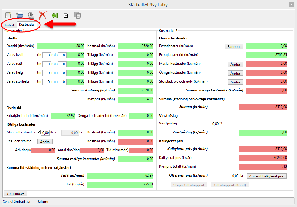 Notera att du hittar Kalkylfliken och Kostnadsfliken i städkalkylens övre vänstra hörn (se bildens nedan).