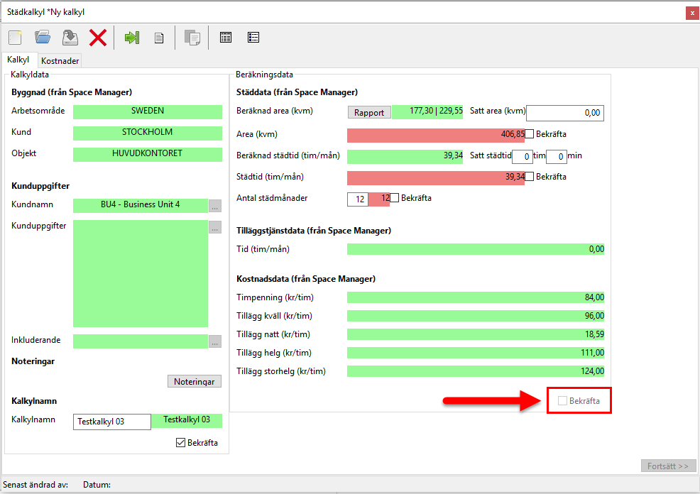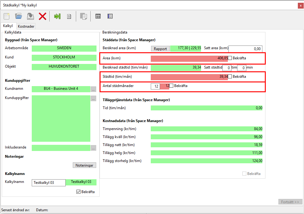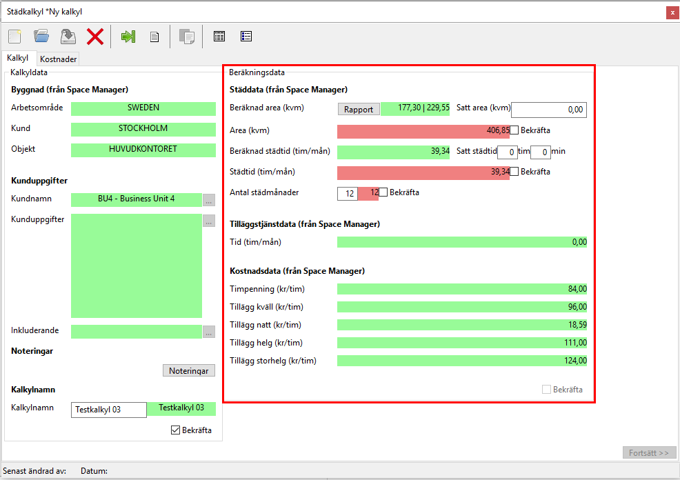 När du arbetat dig genom kalkyldatans röda fält och du även kryssat för den bekräftelsebox du hittar i kalkyldatans nedre högra hörn, kommer beräkningsdatan dyka upp till höger om kalkyldatan i den städkalkyl du arbetar med (se de inringade fälten i bilden nedan).