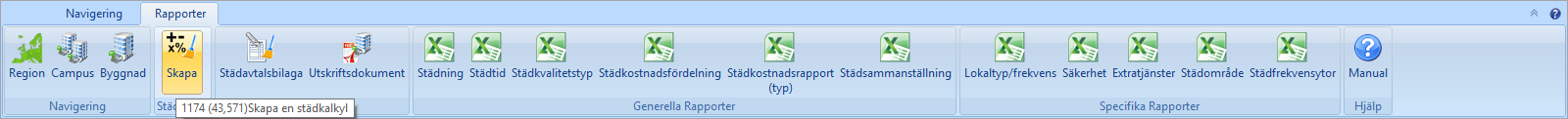 I städkalkylen hittar du nio knappar. De knappar städkalkylen innehåller är placerade i städkalkylens övre vänstra hörn och heter: