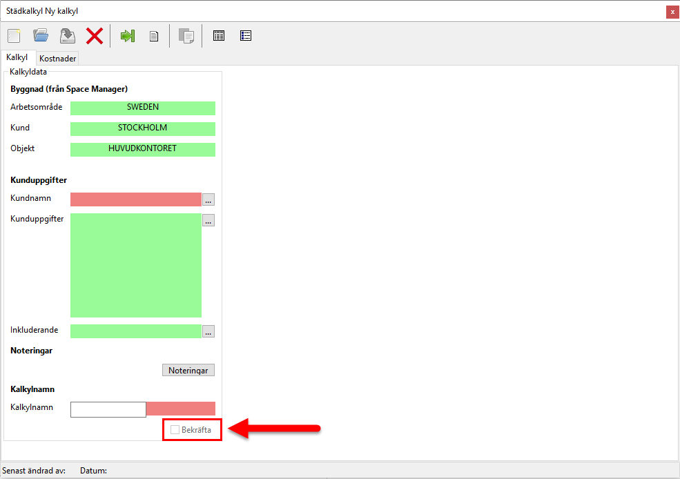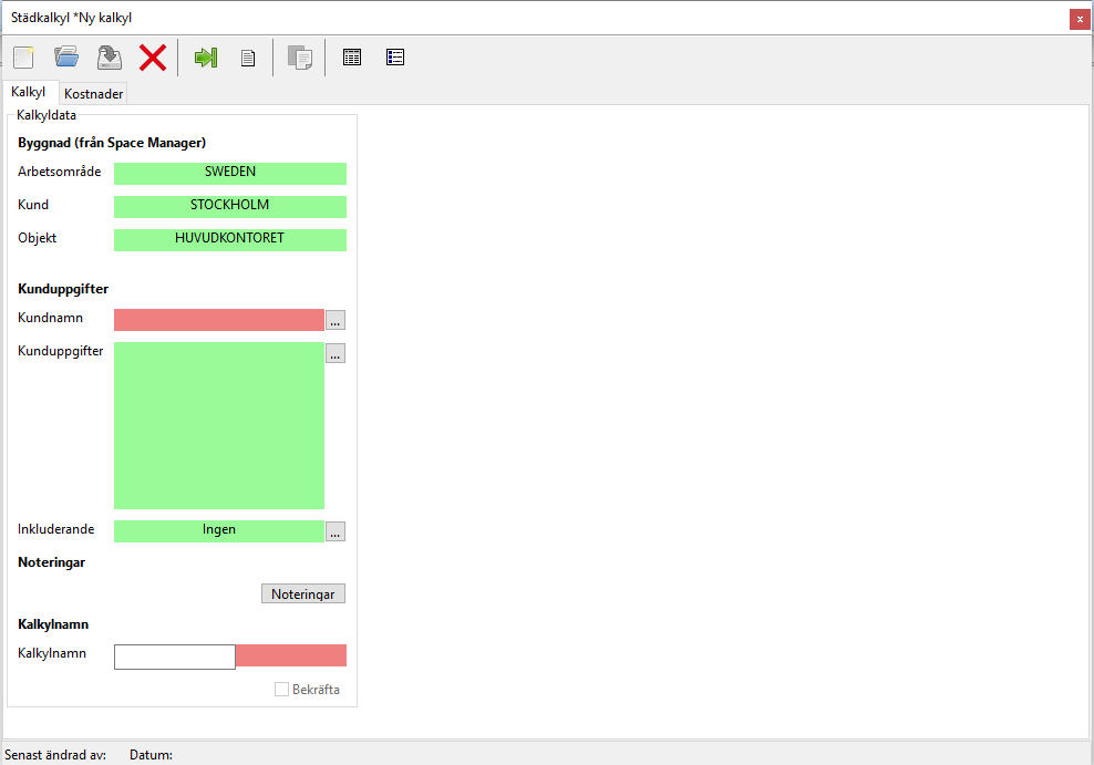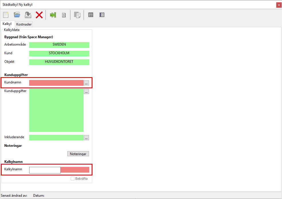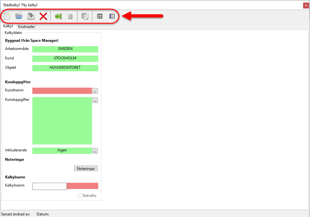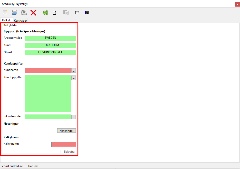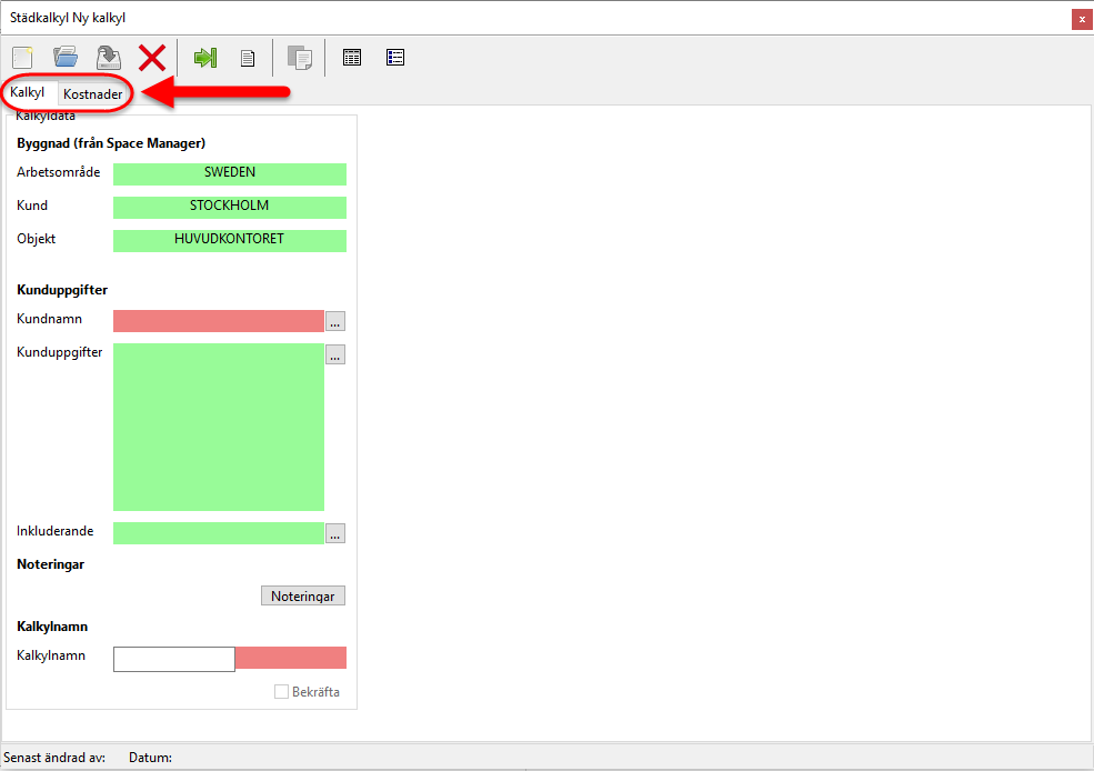 Medan Kalkylfliken till en början kommer vara den enda städkalkylsflik du kommer kunna arbeta under kommer kalkyldatan under Kalkylfliken till en början vara den enda städkalkylsdata du kommer kunna arbeta med (se de inringade fälten i bilden nedan).