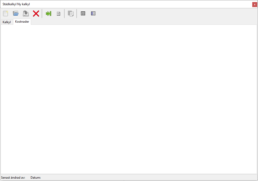 När du klickar på Skapa-knappen i panelen kommer städkalkylsrutan dyka upp på din skärm. I städkalkylsrutan kommer du hitta en ny, tom städkalkyl (se den första bilden nedan). I den nya, tomma städkalkylen kommer du hitta nio knappar (se den andra bilden nedan) och två flikar: en kalkylflik och en kostnadsflik (se den tredje bilden nedan). För en kort introduktion till städkalkylens knappar, se rubriken "Städkalkylens knappar: information om var du hittar dem och vad de heter", längre ner i detta avsnitt. För mer djupgående information om vad du kan använda städkalkylens knappar till, se avsnitt 2.2.1.1. Och för mer information om städkalkylens flikar, fortsätt läsa under den tredje bilden, nedan.